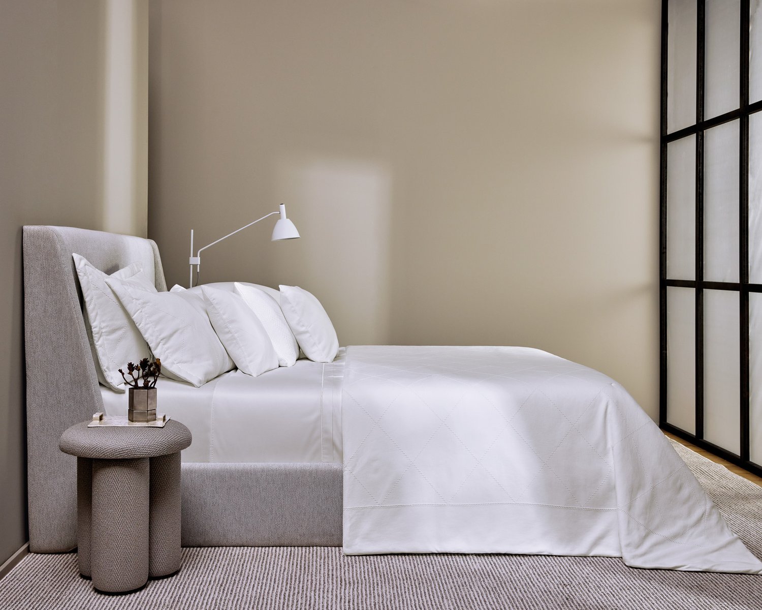 A colcha portuguesa, tecida em jacquard, exibe toda a elegância das linhas retas. Em sua tonalidade branca, irradia suavidade e requinte, tecendo uma atmosfera romântica que envolve o ambiente. Batizada com o nome do poeta Sovoire, sua história está entrelaçada com as belezas de Cinque Terre, adicionando uma aura poética e encantadora a cada ponto.