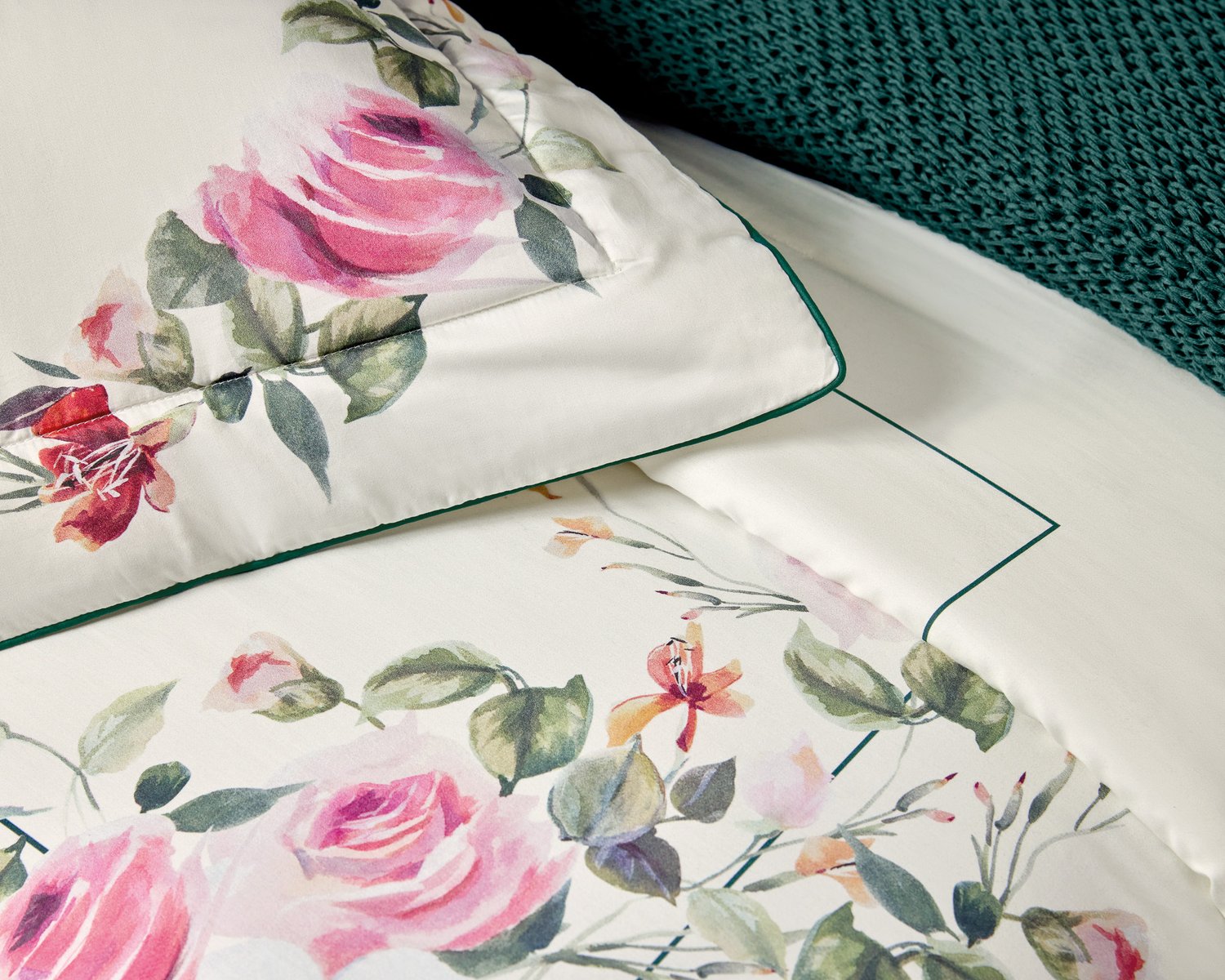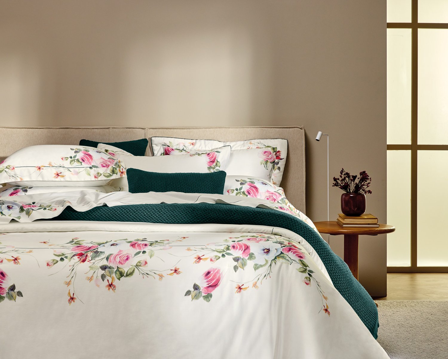 A romântica cama Rosette, em estamparia digital, imprime um desenho feito à mão por um estúdio criativo italiano. As rosas de seus buquês são inspiradas nas rosas plantadas no início e no fim dos vinhedos em Groppo, um pequeno vilarejo localizado em Manarola. As flores servem para proteger as parreiras de formigas. Além disso, as rosas também estão aos pés da estátua La Donna Dell’Uva, que homenageia o vinho da região.