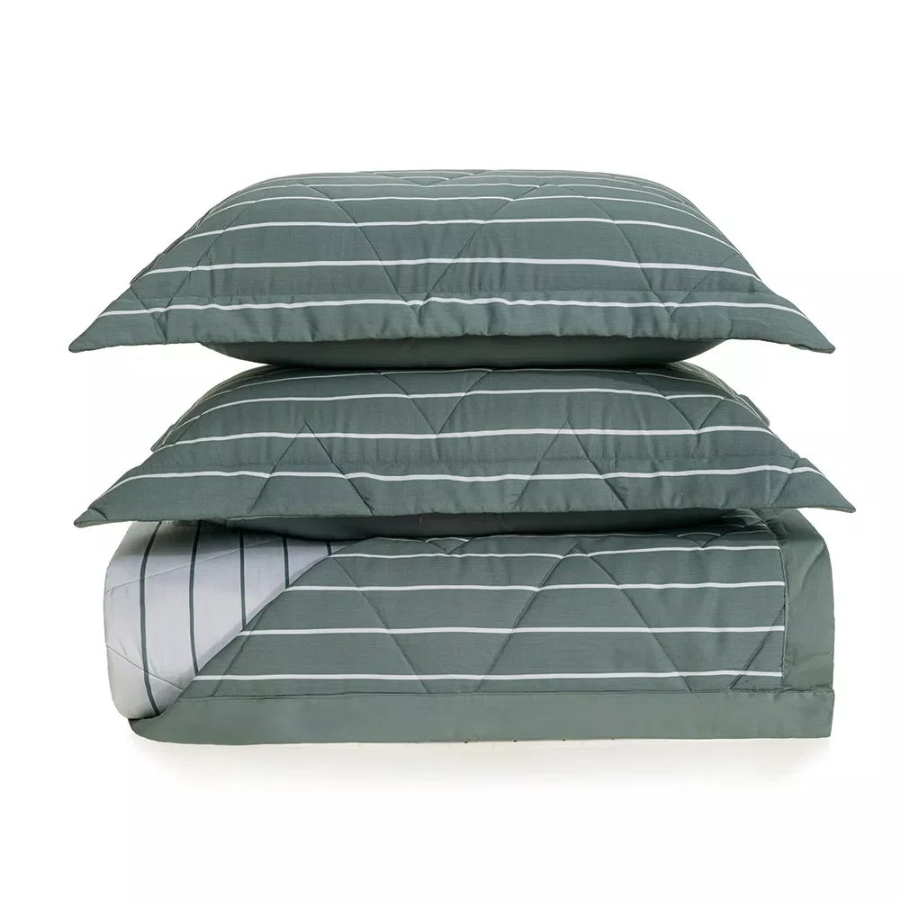 O Jogo de Colcha Saggiano Trussardi é a escolha perfeita para quem busca ornamentar o ambiente do quarto com um toque metropolitano e sofisticado. Confeccionado em cetim 300 fios, 100% em algodão egípcio, o conjunto oferece uma textura macia e durável, garantindo conforto e elegância durante a usabilidade. Inspirado nas listras clássicas em tons de verde, que refletem as cores das janelas e portas das casas italianas incrustadas nas rochas, o Jogo de Colcha Saggiano traz personalidade e estilo ao ambiente. O porta-travesseiro com matelassado adiciona um detalhe refinado e inusitado, elevando a decoração a um novo patamar de sofisticação.