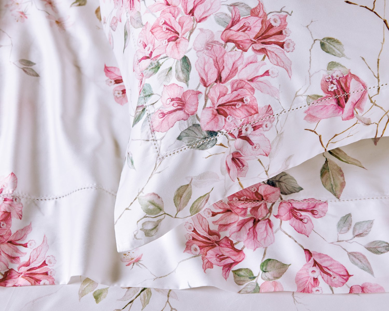 Mergulhe na essência vibrante e no esplendor da natureza de Cinque Terre. Inspirada nas exuberantes bougainvílias que envolvem paredes e terraços por toda a costa italiana, a cama Venere apresenta um intricado e fluido floral pintado à mão em delicadas pinceladas de aquarela. O design único é realçado por cores vívidas e convidativas, estampado sobre 300 fios de cetim de puro algodão. Venere evoca a sensação de um convidativo jardim mediterrâneo para o seu ambiente.