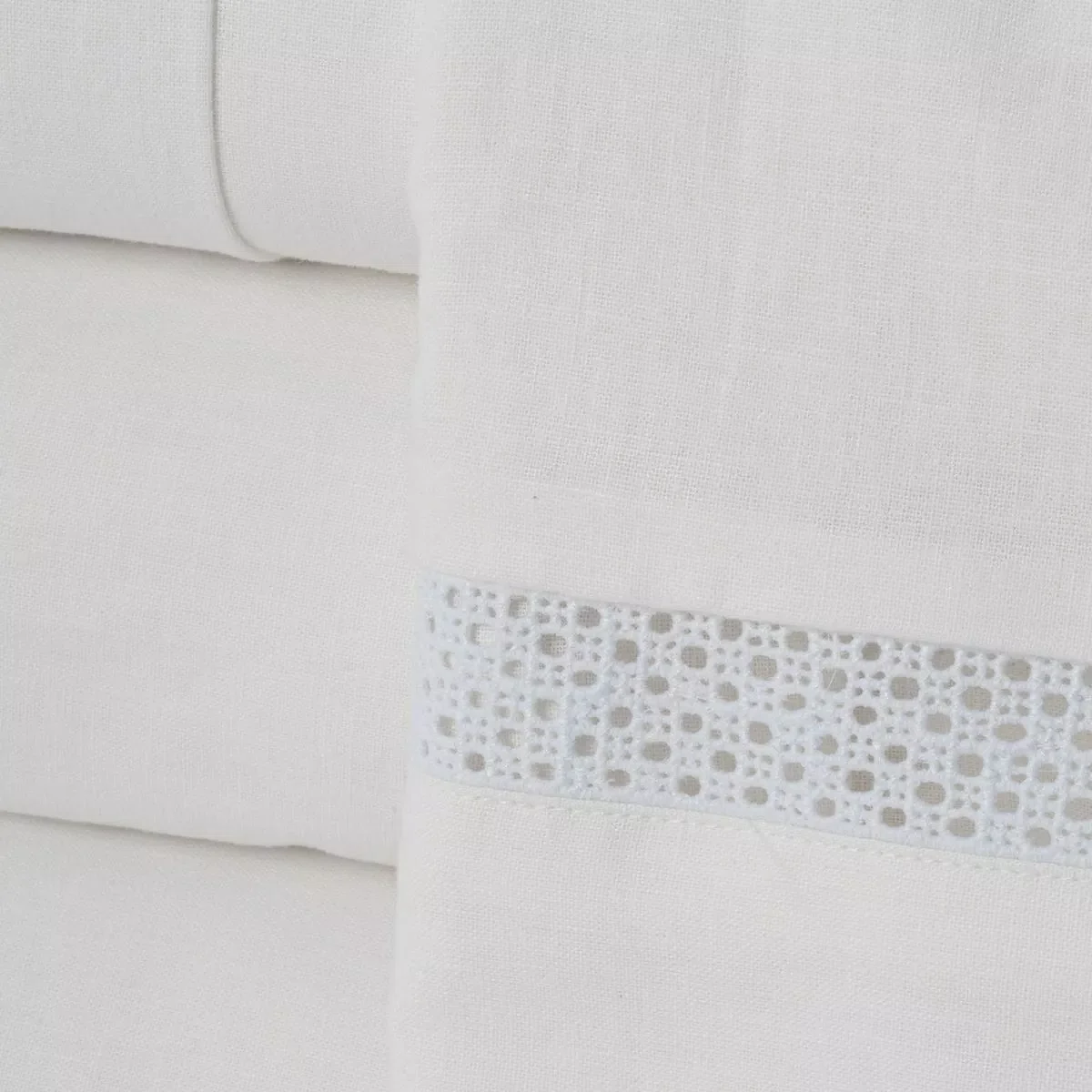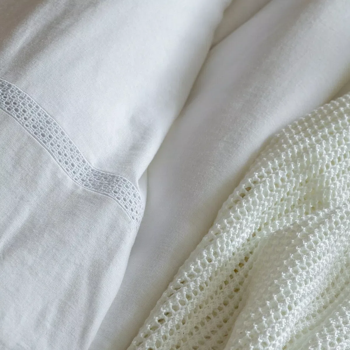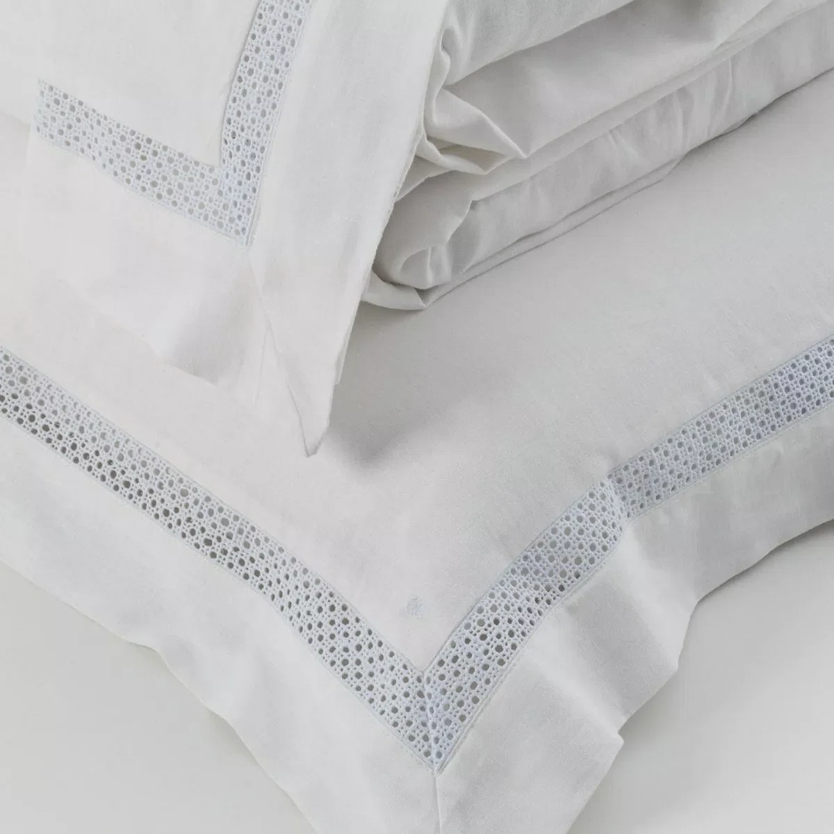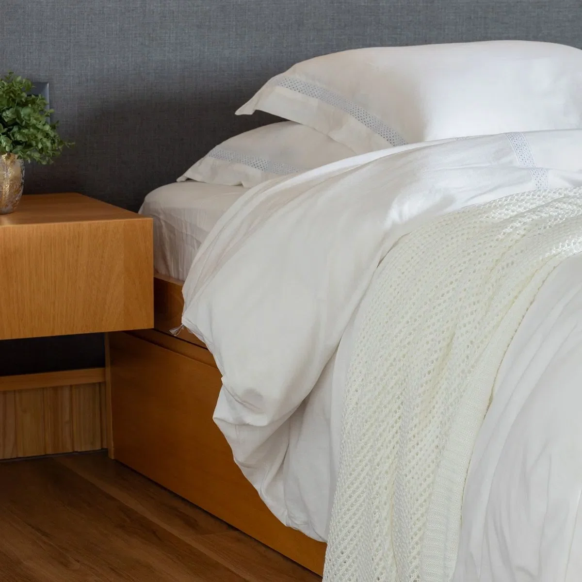 Cama SQUARE traduzida nas linhas retas bordadas no entremeio que emoldura as peças em puro linho. É o equilíbrio em sua decoração e deixam o ambiente moderno e requintado..