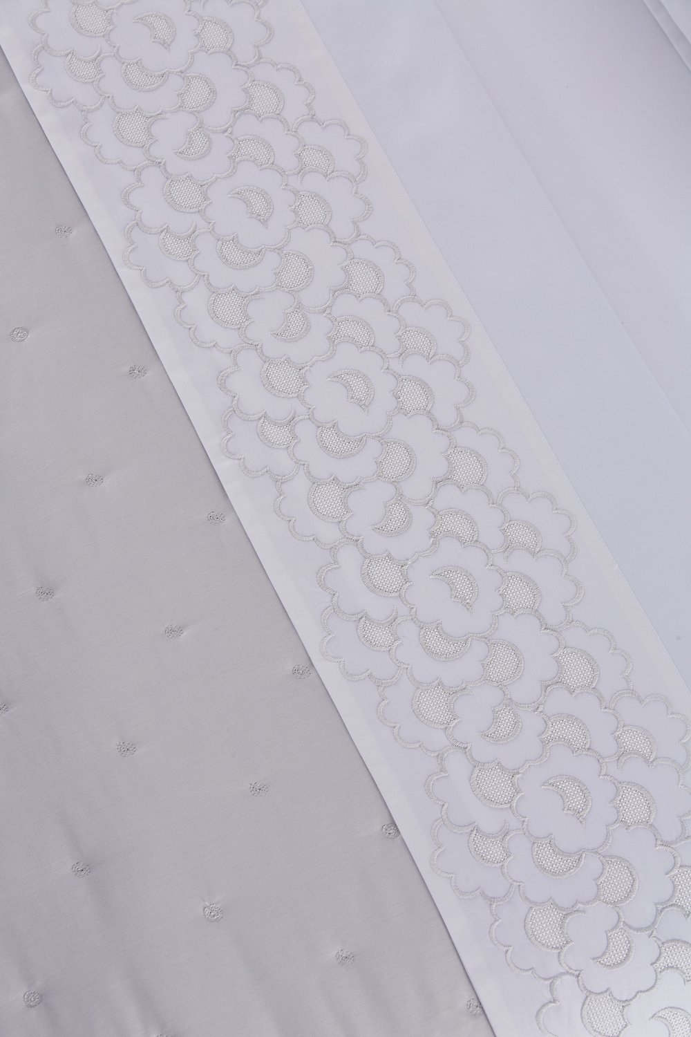 O jogo de lençol Festons reinventa a elegância dos anos 20 com um bordado floral leve e delicado, emoldurado em cetim branco puro.