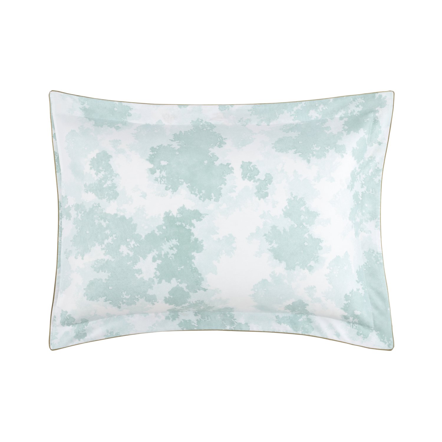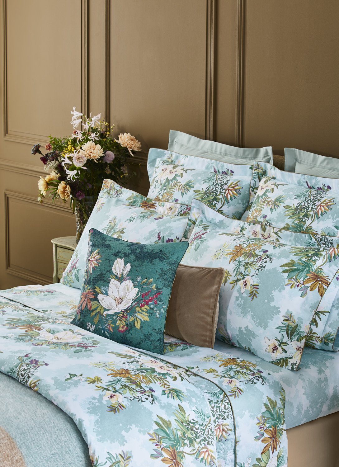 Roupa de cama estampada e dupla face. 100% cetim de algodão orgânico penteado de fibra longa, 300 fios. 15 cores para o desenho principal, 3 cores para o desenho coordenado. Produzido na França.