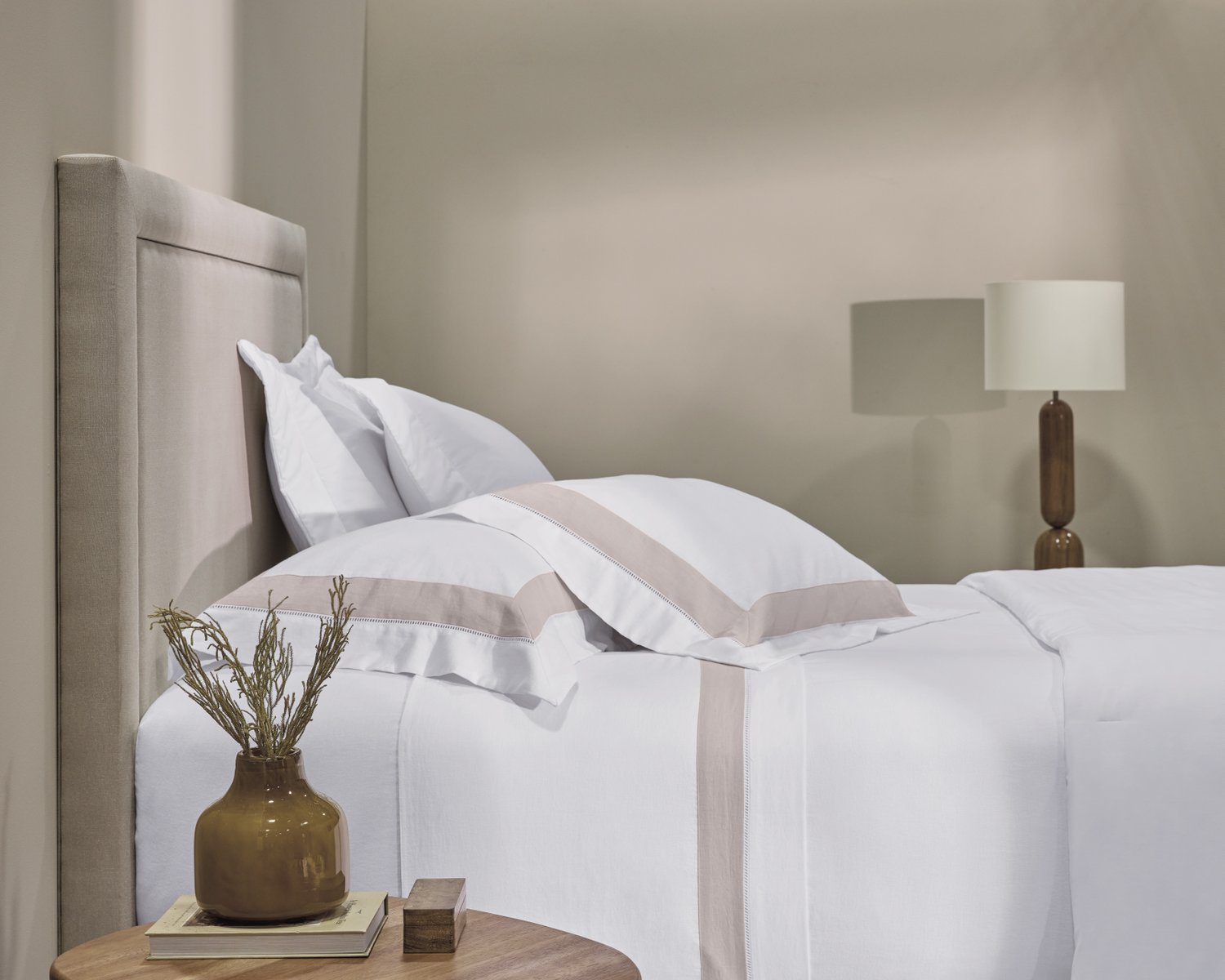 O linho traduz a busca contínua pela sofisticação, refletindo leveza e atemporalidade. A cama Rivus oferece um design clássico e um equilíbrio harmonioso entre tons neutros, destacados por um delicado entremeio bordado. O linho, uma fibra nobre altamente absorvente com propriedades antibacterianas, permite que a pele respire e não retenha umidade. Sua textura suave emana frescor ao toque e evoca uma elegância natural para o seu quarto.