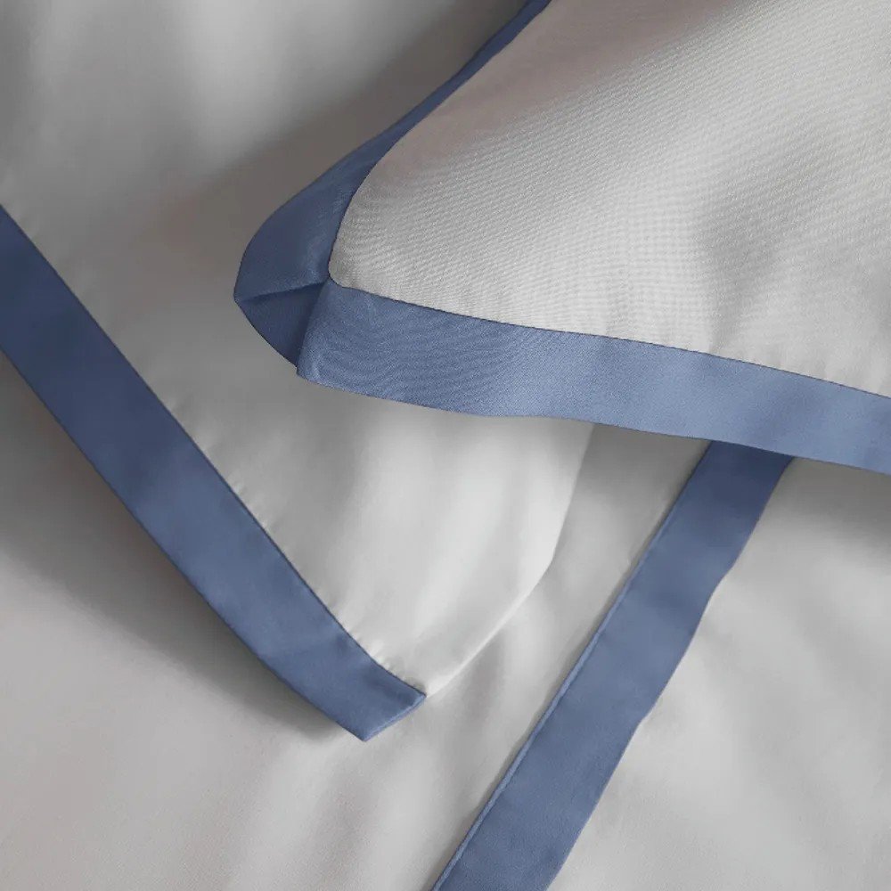 Acabamento | Fio Percal. Tecido mercerizado. Fronhas e dobra feita com aplicação de detalhe tinto. |