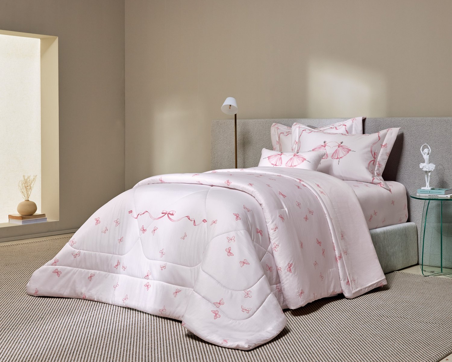 O ballet é uma expressão de arte sublime, é como uma aquarela, delicada e fluida onde cada movimento é como uma pincelada que captura a essência da emoção, uma mistura de cores e formas que se desdobram em perfeita harmonia. A cama Ballerina nos convida a sonhar, a vivenciar a arte em suas múltiplas formas, e sobre a maciez do cetim de algodão 300 fios celebrar um espetáculo de graça e beleza.