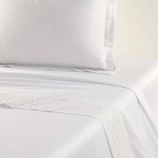 O jogo de lençol Festons reinventa a elegância dos anos 20 com um bordado floral leve e delicado, emoldurado em cetim branco puro.