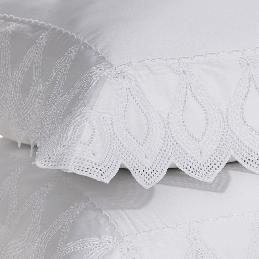 Acabamento: Fronha com 3 abas, tira bordada aplicada e canto inglês. Dobra feita com tira de bordado aplicada.
