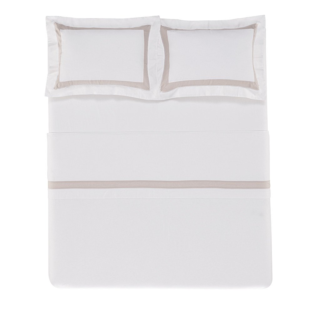 Tamanho: Lençol de cima 2,80m x 2,60m; Lençol de baixo com elástico 1,93m x 2,03m x 40cm; Fronha 50cm x 70cm