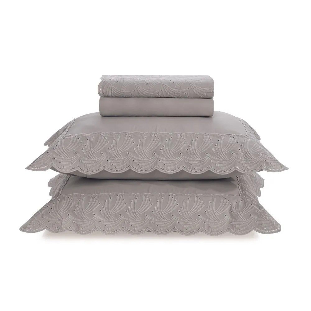 Acabamento | Tecido sanforizado e mercerizado. Fronha com 3 abas com tira bordada aplicada de algodão e canto inglês. Dobra feita com barrado bordado de algodão. Lençol de baixo com elástico liso. Toque acetinado. |