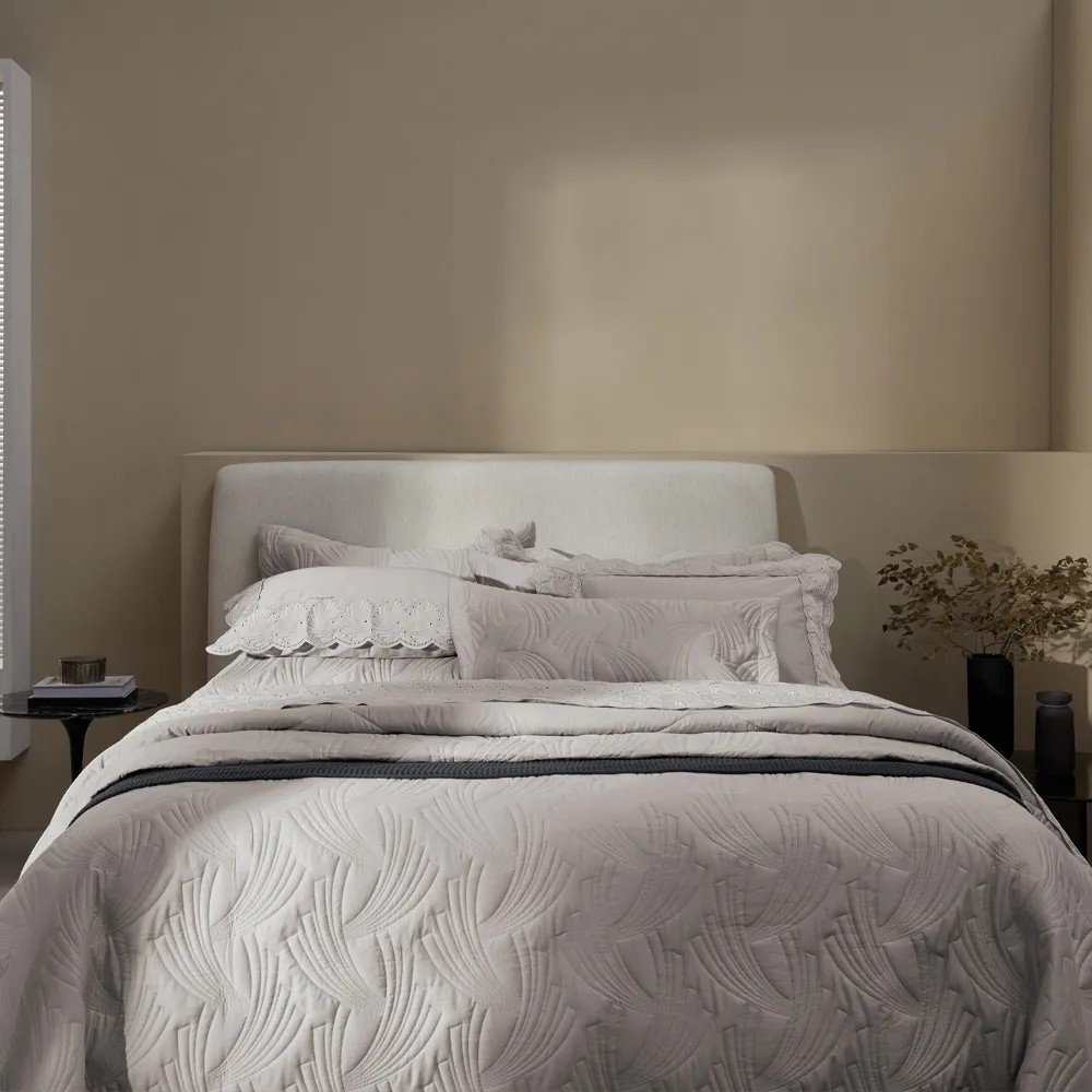 O jogo de cama Scalvini Queen, combina contemporaneidade e requinte, com bordados em tom de marmo inspirados no caminho do Funicolare, que liga as cidades de Bérgamo, inspirando um movimento contínuo e formidável. Cada ponto deste conjunto de 300 fios evoca sofisticação e movimento, criando uma experiência de conforto e elegância atemporais.