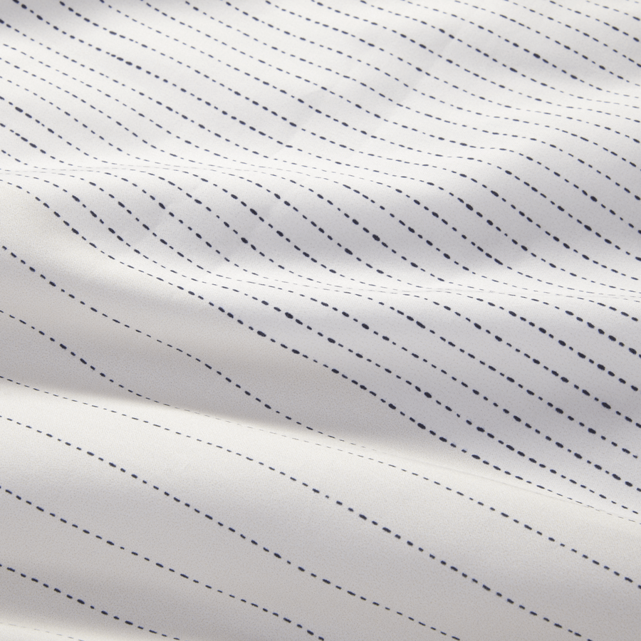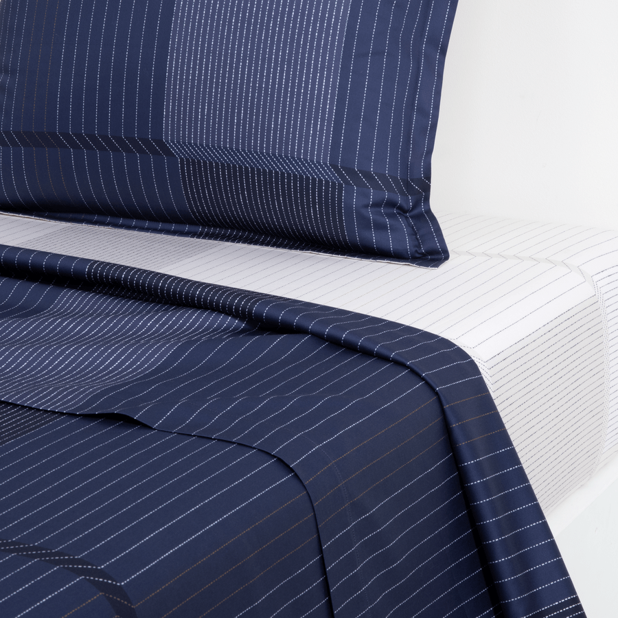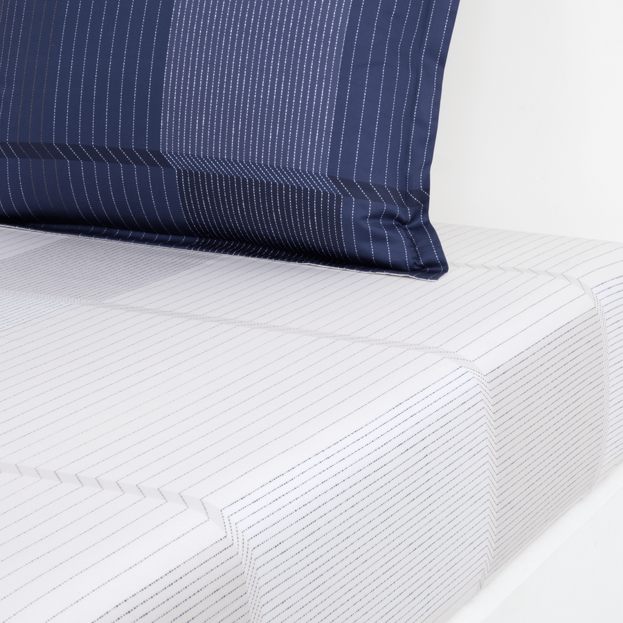 Tomando emprestados os códigos icônicos da marca, este jogo de lençol é estampado em cetim de algodão. As faixas rítmicas seguem umas às outras, um salto no alinhamento engana os olhos, criando um efeito óptico surpresa.