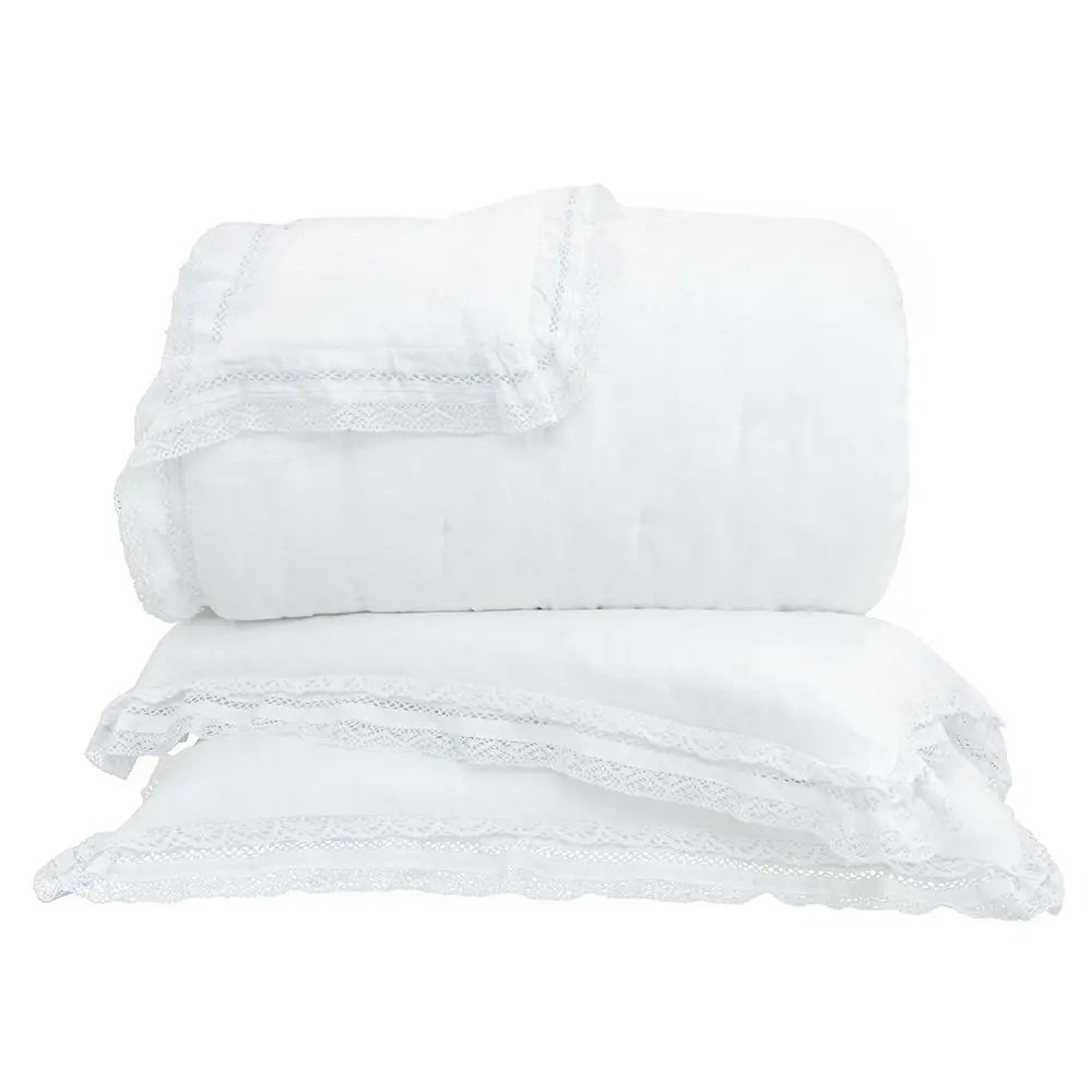 Kit colcha King Linetta - Buddemeyer Luxus. Encantadora e muito refinada, a Colcha Linetta exalta elegância e serenidade em cada detalhe. A pureza do branco, combinada com a ancestralidade do linho, convida a um mergulho sensorial, onde o luxo encontra o conforto em seu ápice. Os detalhes em capitonês criam efeito acolchoado, conferindo volume e beleza ao modelo. E a moldura rendada revela camadas de suavidade e romantismo em sua forma mais essencial. Com toque extremamente agradável para a pele, possui maciez absoluta, proporcionando experiências aconchegantes para momentos inigualáveis. A Buddemeyer é referência em qualidade e estilo.