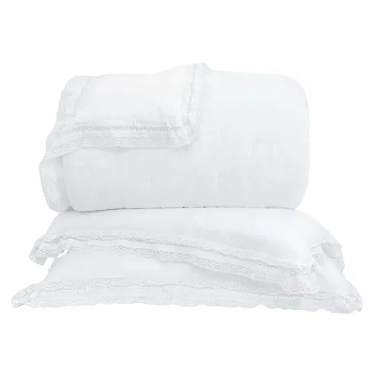 Cor: Branco Marca: Buddemeyer Luxus Conteúdo: 1 colcha 307cm x 258cm / 2 porta-travesseiro 50cm x 70cm / 8cm de aba nos três lados Composição: 100% linho / enchimento 100% poliéster Tipo de Material: 100% linho / enchimento 100% poliéster Instruções de Cuidado: Cores escuras devem ser lavadas separadas das cores claras / Lavar em água fria ou em temperatura de até 60°C / O melhor sabão para manter as características do produto é o de coco ou neutro / Não colocar sabão diretamente no produto / Evite alvejantes e quaisquer produtos a base de cloro, eles atacam o corante dos tecidos / Não exagere no uso de sabão em pó e use pouco amaciante / Permite secadora em temperatura baixa / Temperatura máxima da base do ferro 110°C / Não usar ferro a vapor / Não lavar a seco