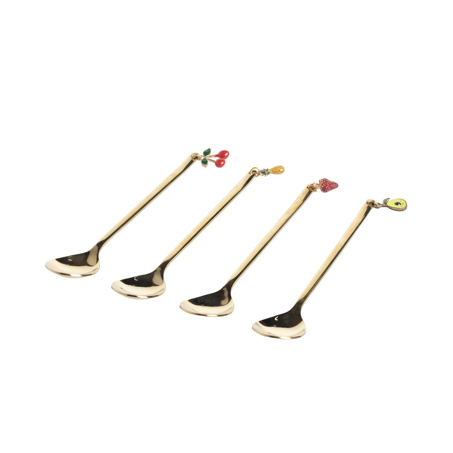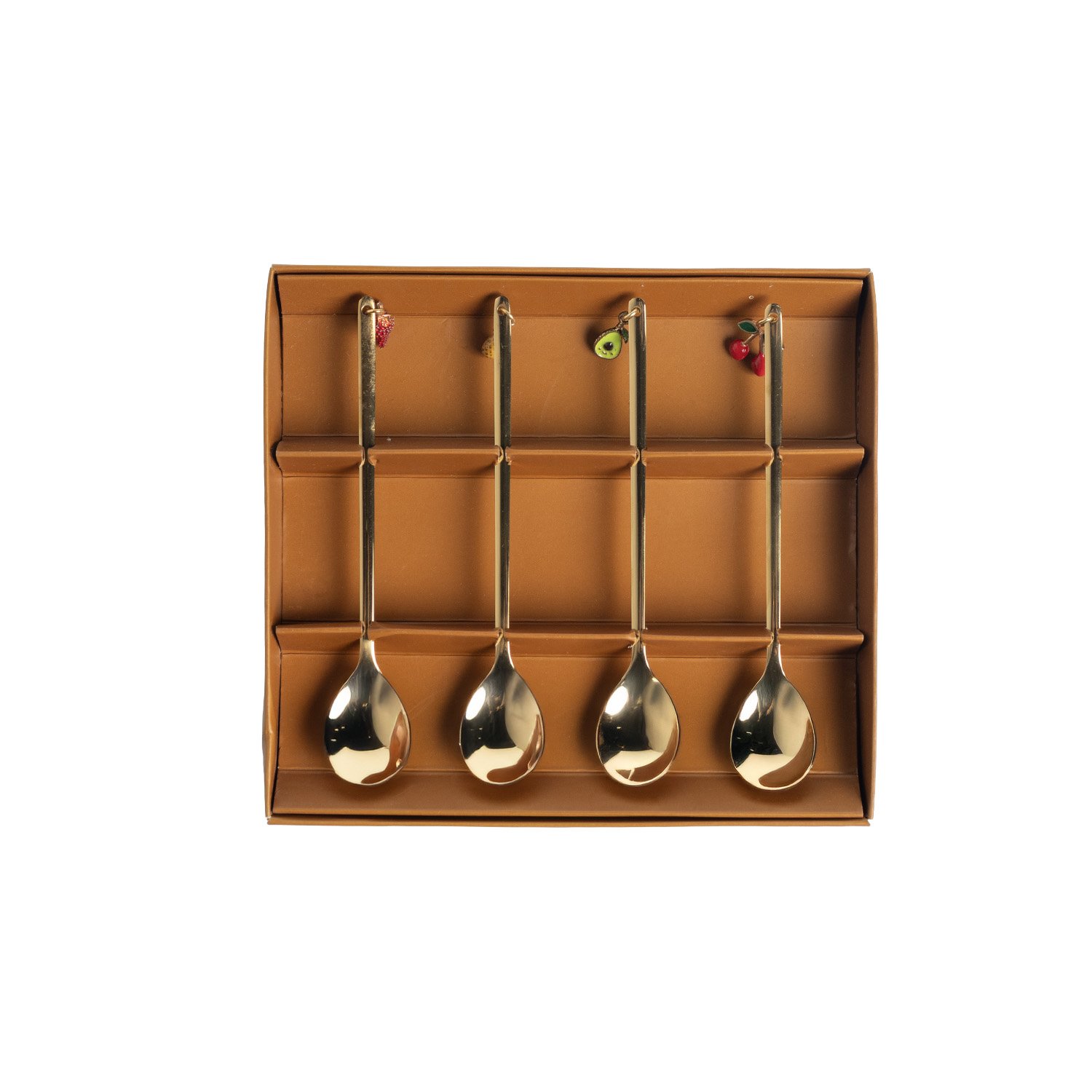 Jogo 4 colheres de chá/ aperitivo em aço inox com pintura dourada e pingentes decorativos.