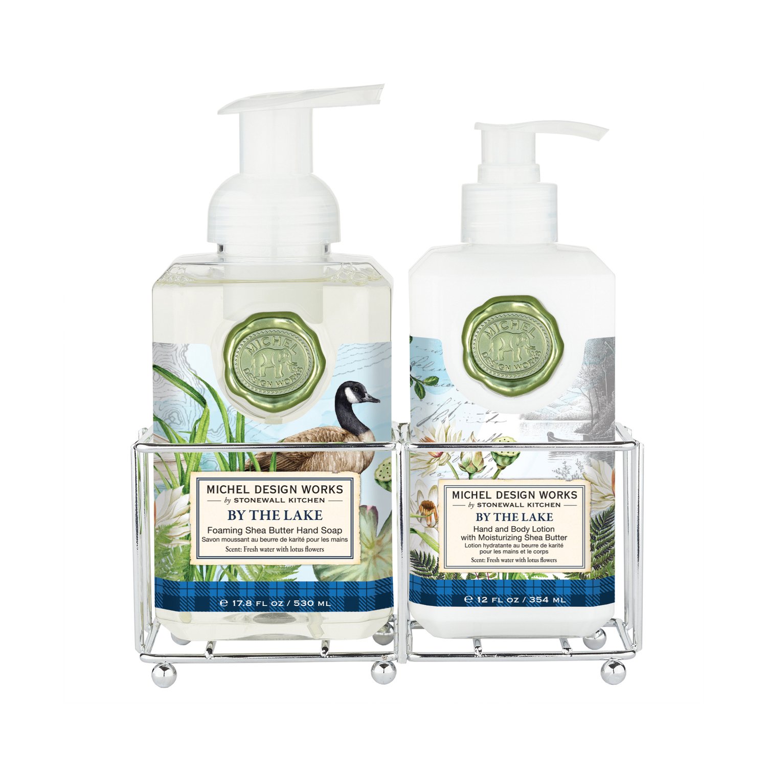 Conjunto em suporte de metal com o sabonete líquido em espuma (530ml) e o creme hidratante (236ml), ideal para uso em banheiros ou na cozinha.