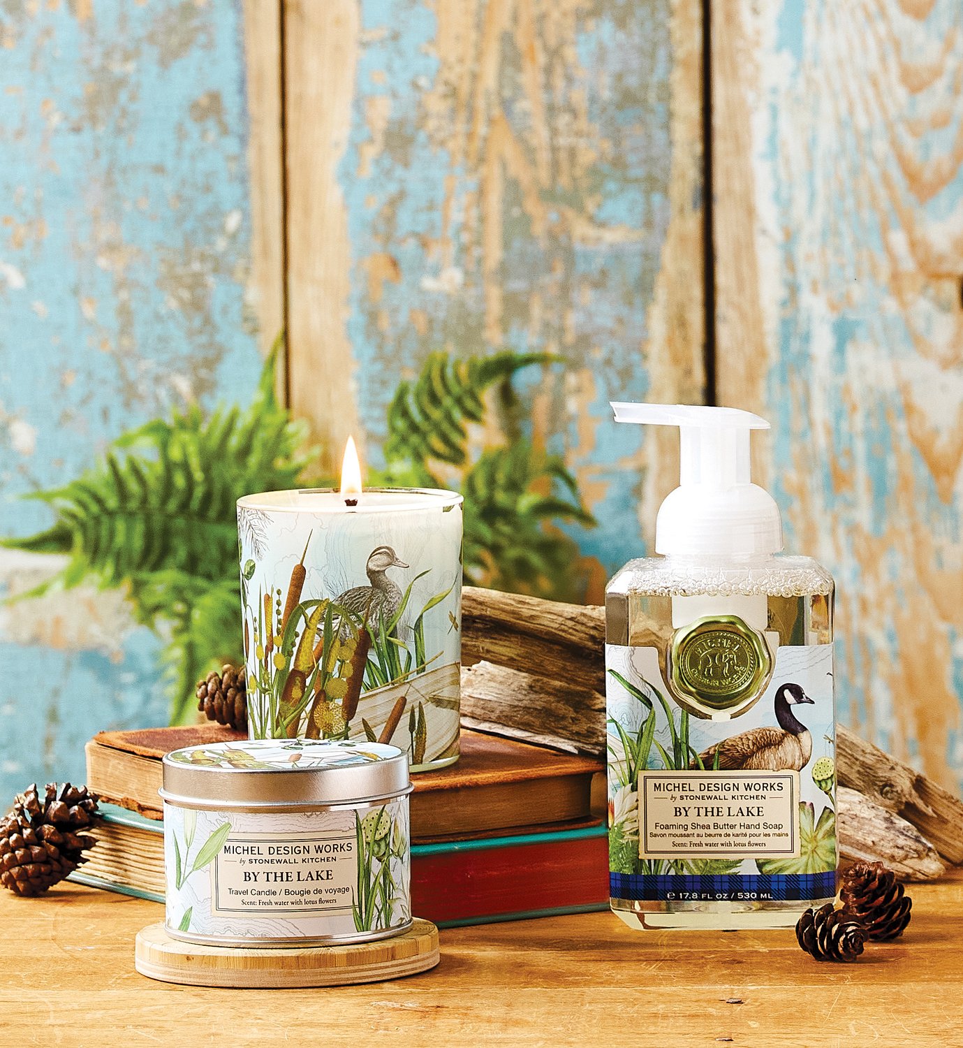 Esta coleção By the Lake captura os aromas e visões da vida em uma cabana à beira de um lago sereno e pacífico. Aprecie a cena e vislumbre aves aquáticas e peixes escondidos entre as folhagens à beira do lago.