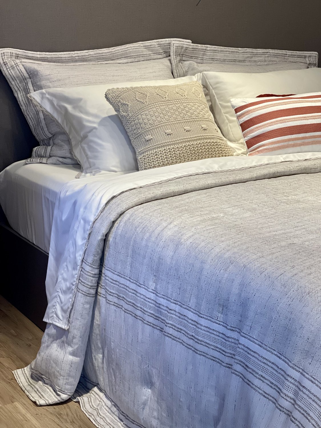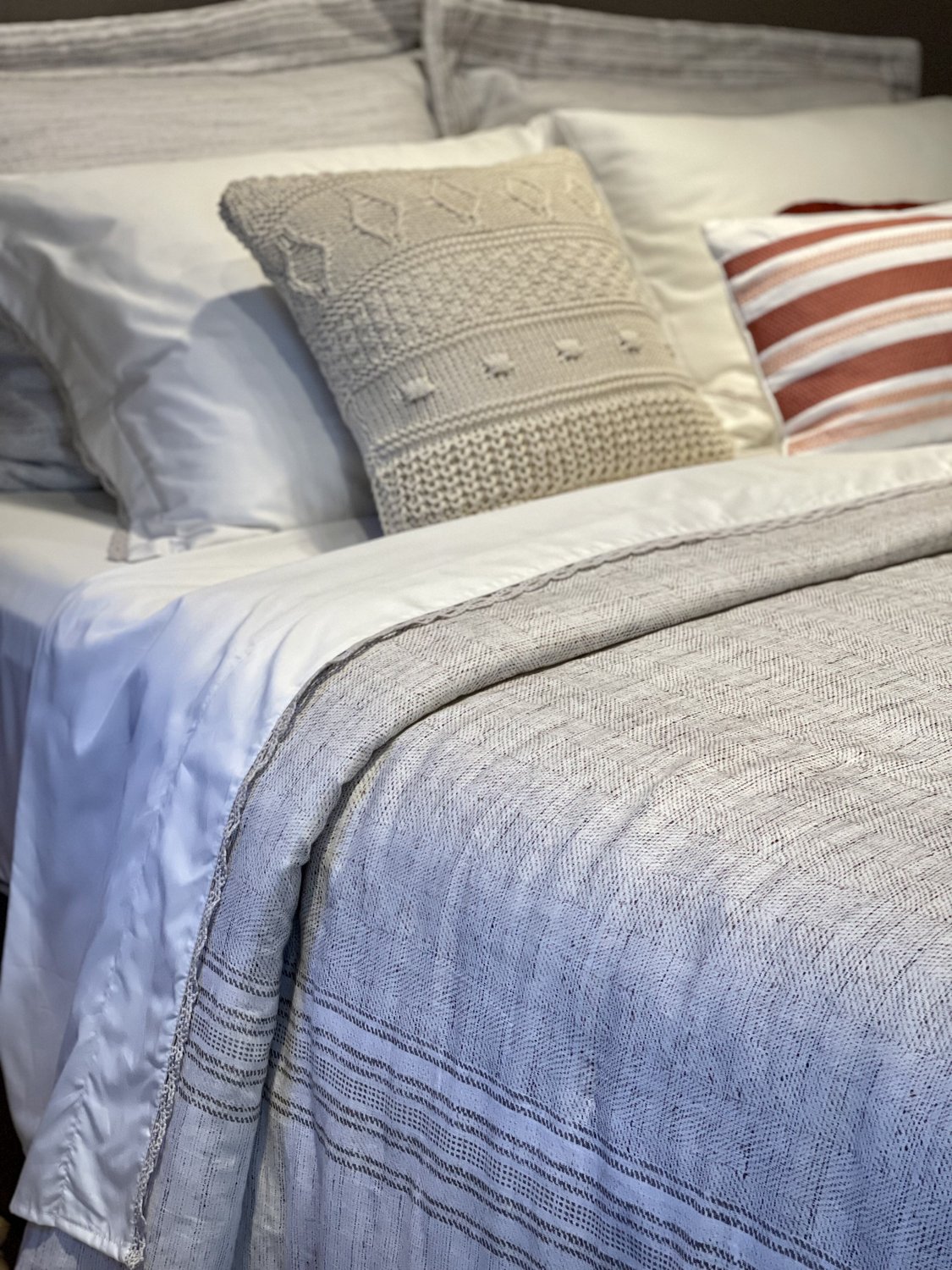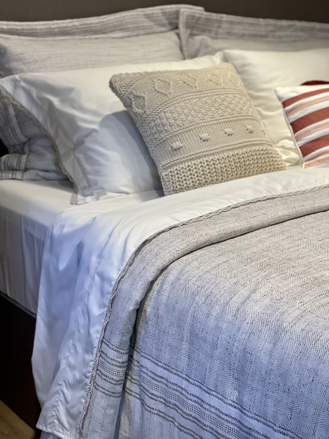 No clássico linho, revela uma personalidade despojada e sofisticada. Apresenta textura de teares na cor bege e padrão chevron ao centro, já as laterais são emolduradas com listrados desgastados de forma sutil. Com toque inconfundível do linho e repleto de maciez, a colcha é dupla face e volumosa como um edredom, conferindo maior conforto, beleza e aconchego para uma noite de sono relaxante.