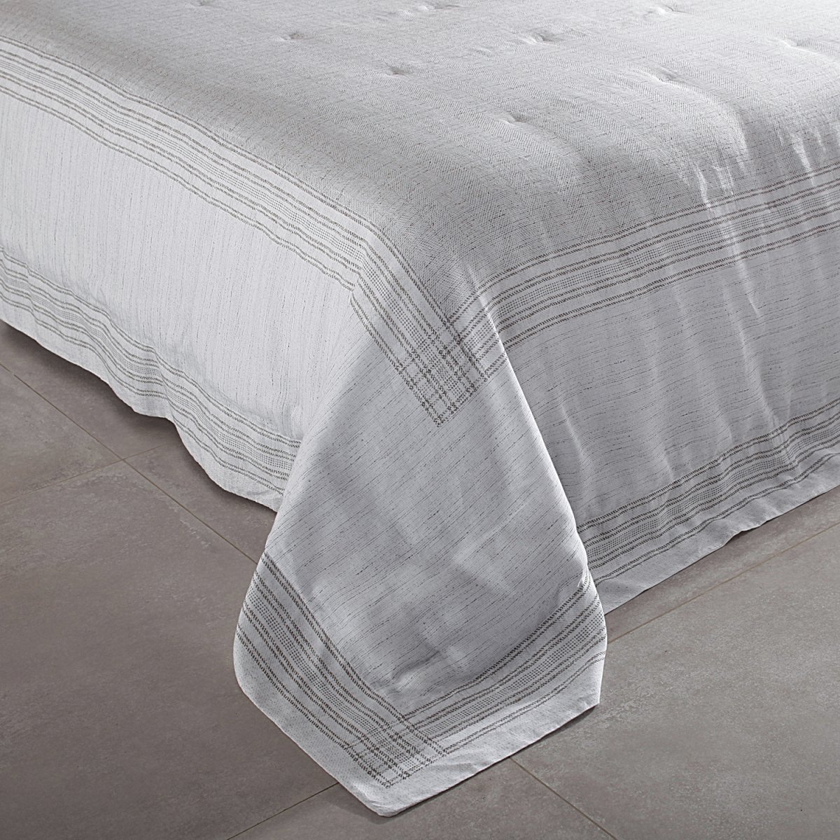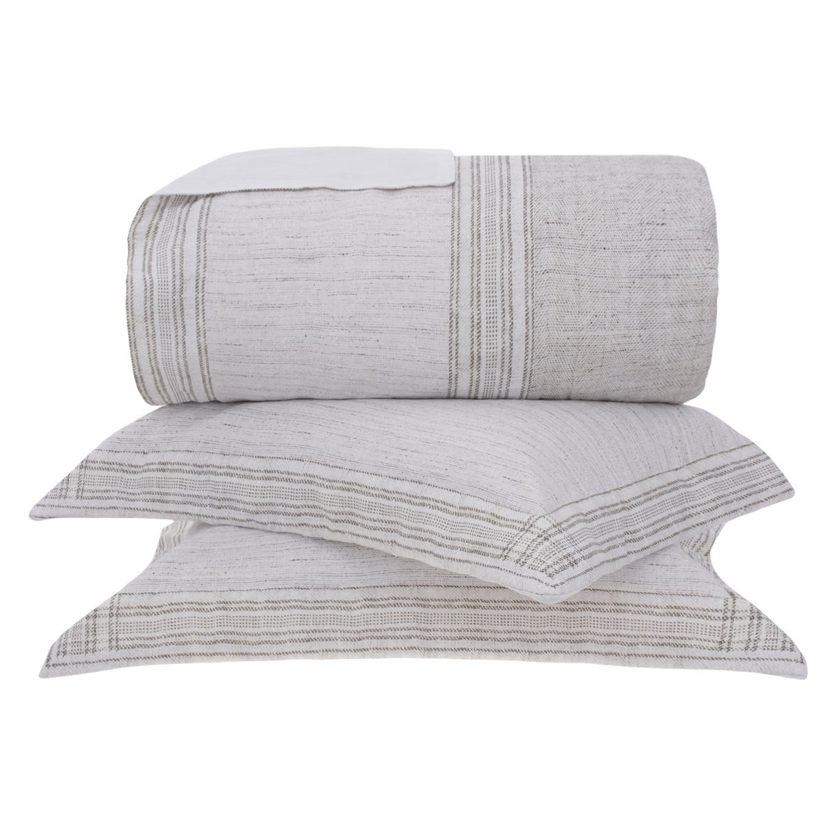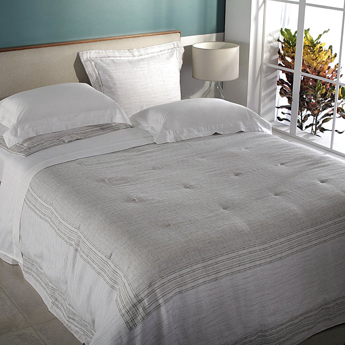 No clássico linho, revela uma personalidade despojada e sofisticada. Apresenta textura de teares na cor bege e padrão chevron ao centro, já as laterais são emolduradas com listrados desgastados de forma sutil. Com toque inconfundível do linho e repleto de maciez, a colcha é dupla face e volumosa como um edredom, conferindo maior conforto, beleza e aconchego para uma noite de sono relaxante.