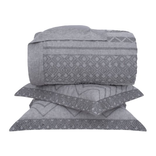 Acabamento: Colcha: Com bordado; Porta travesseiro: dispõe de abas nos três lados com fechamento envelope lateral.
