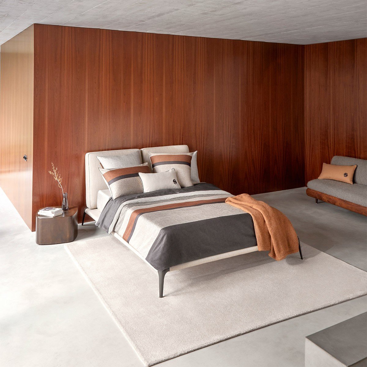 A estampa Carlow evoca belos tecidos de lã. Listras largas em tons naturais mesclados, que vão do bege acinzentado ao antracite, com alguns detalhes em ferrugem. No verso, o efeito tecido em tom bege acinzentado equilibra o efeito geral.