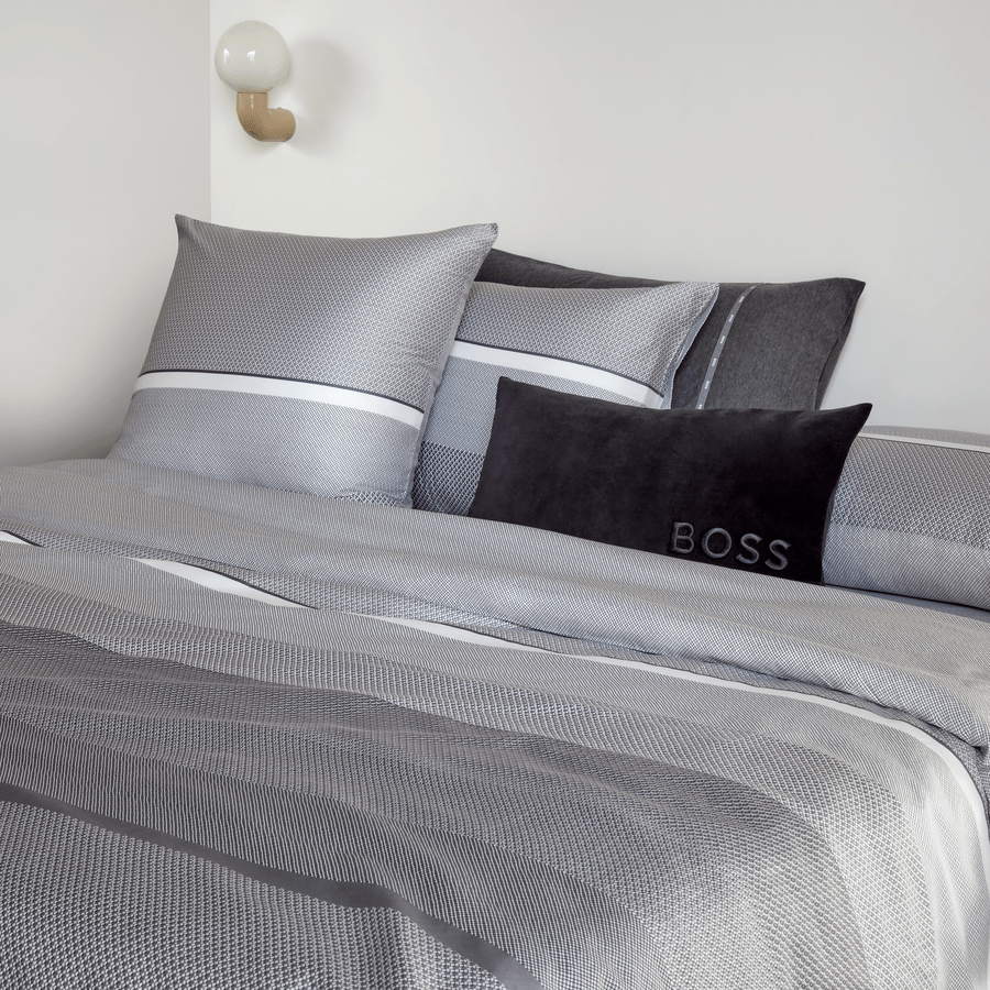A linha Boss Home reflete as coleções de roupas da marca, oferecendo qualidade superior e estilo impecável. As roupas de cama, roupões e toalhas, assim como todos os acessórios Hugo Boss utilizam matérias-primas macias e naturais. Os detalhes dos designs nas roupas de cama são inspirados por sua alfaiataria de acordo com o icônico terno Hugo Boss, moderno, elegante e estruturado.