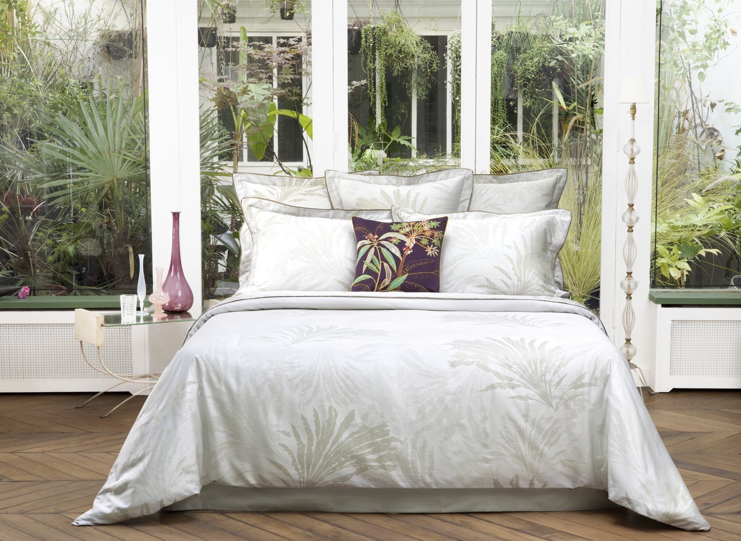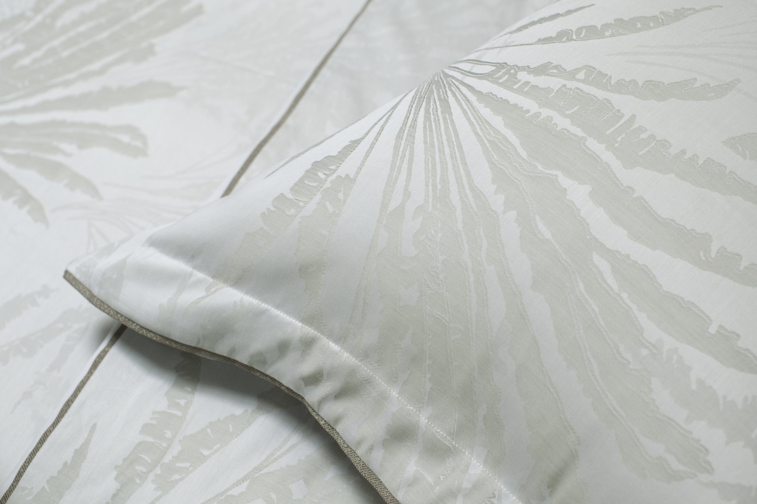 Uma coleção de roupa de cama exótica com um toque de verão. No interior, as grandes palmeiras lembram o charme atemporal e elegante de uma Riviera ensolarada. A coleção Palmea é produzida em tecido Damask com detalhe de plantas prateadas, compostas por luz e sombra. Composta 100% de algodão acetinado 300 fios de fibra longa e acabamento mordorê.