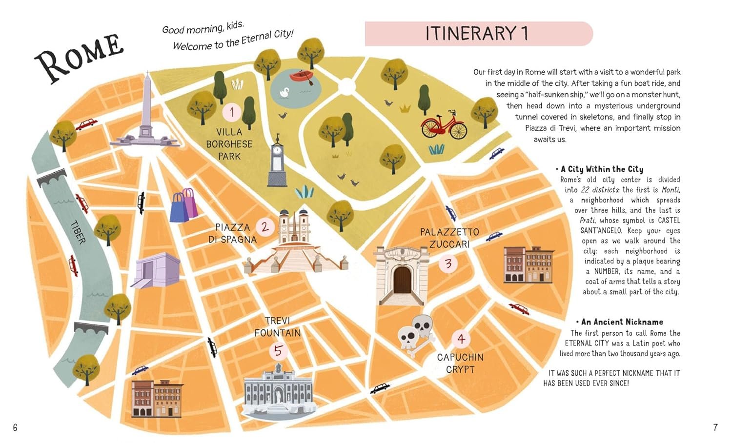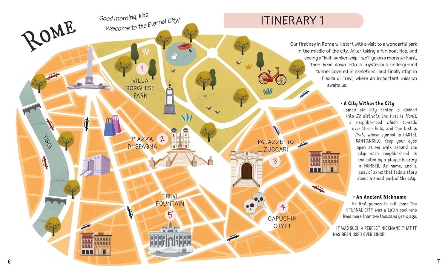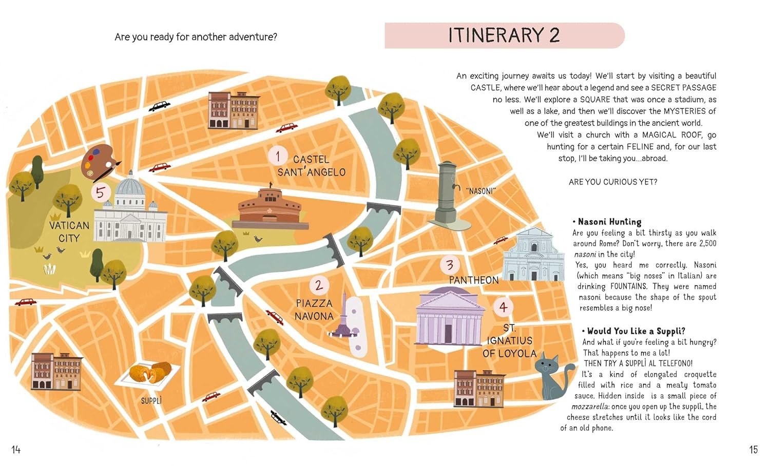As crianças podem explorar Roma com este divertido guia de viagem feito especialmente para elas! A curiosidade infantil é inata e aumenta ainda mais quando se viaja. Com este guia infantil, elas podem visitar pontos turísticos populares de Roma, como o Coliseu, o Panteão e a Fontana di Trevi. O livro é dividido em diferentes roteiros e inclui informações sobre cada local icônico visitado. Pode ser usado como inspiração para viagens ou para levar em uma viagem real a esta cidade histórica.