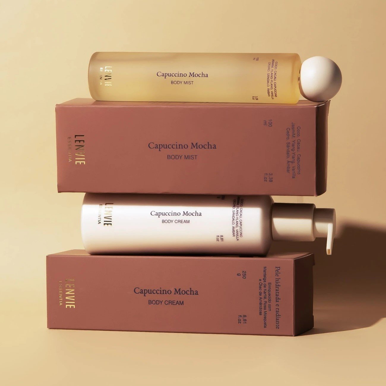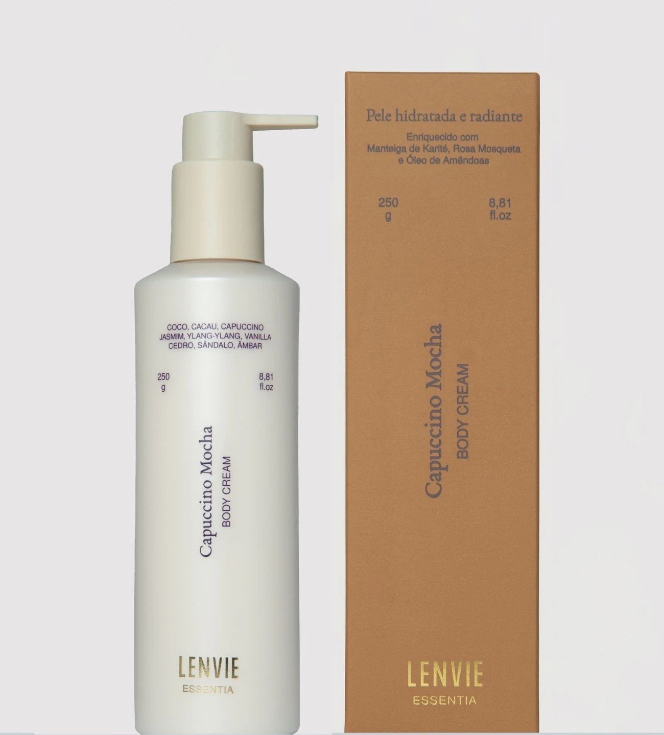 A linha Essentia da LENVIE transforma o cuidado diário em um momento de bem-estar, combinando hidratação e perfumaria sofisticada. A Loção Hidradante Capuccino Mocha oferece uma hidratação profunda, deixando a pele macia, nutrida e com sensação aveludada. Sua fórmula possui textura rica e cremosa, que espalha facilmente e é rapidamente absorvida, garantindo conforto sem deixar a pele pegajosa. Sua fragrância marcante combina acordes deliciosos de coco, cacau e capuccino, criando um aroma quente e envolvente. O toque de notas florais e amadeiradas complementa a composição, trazendo sofisticação e equilíbrio ao perfume.