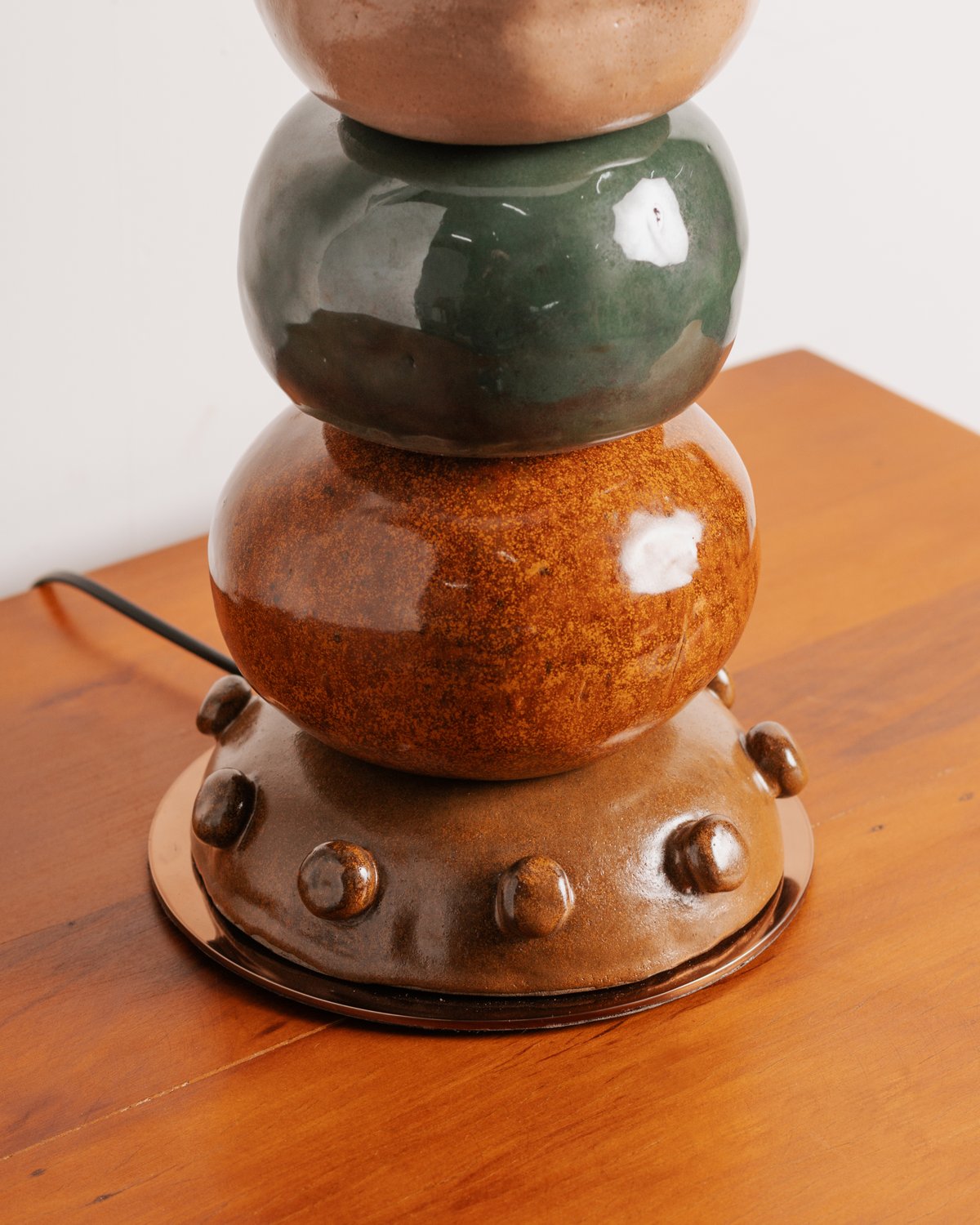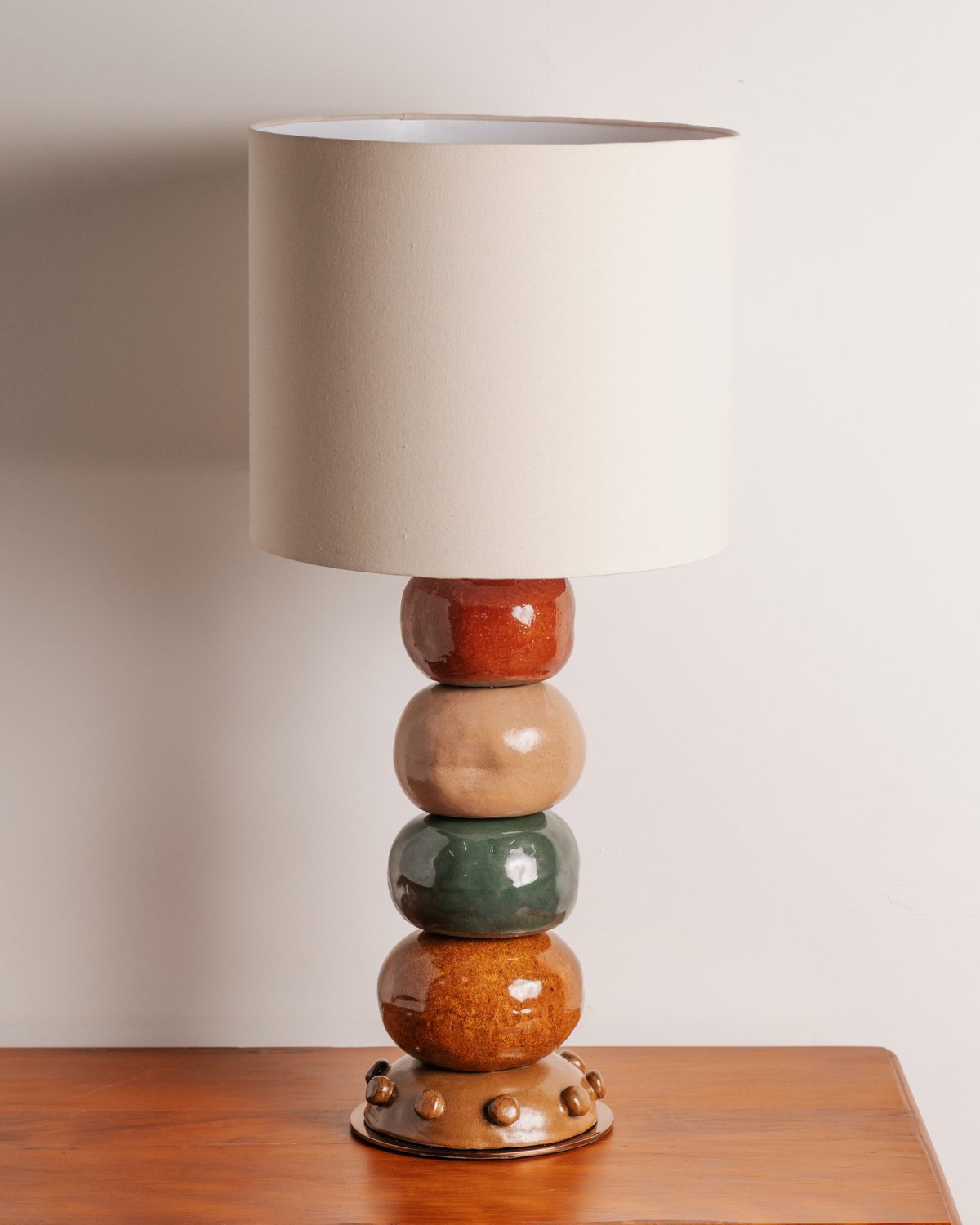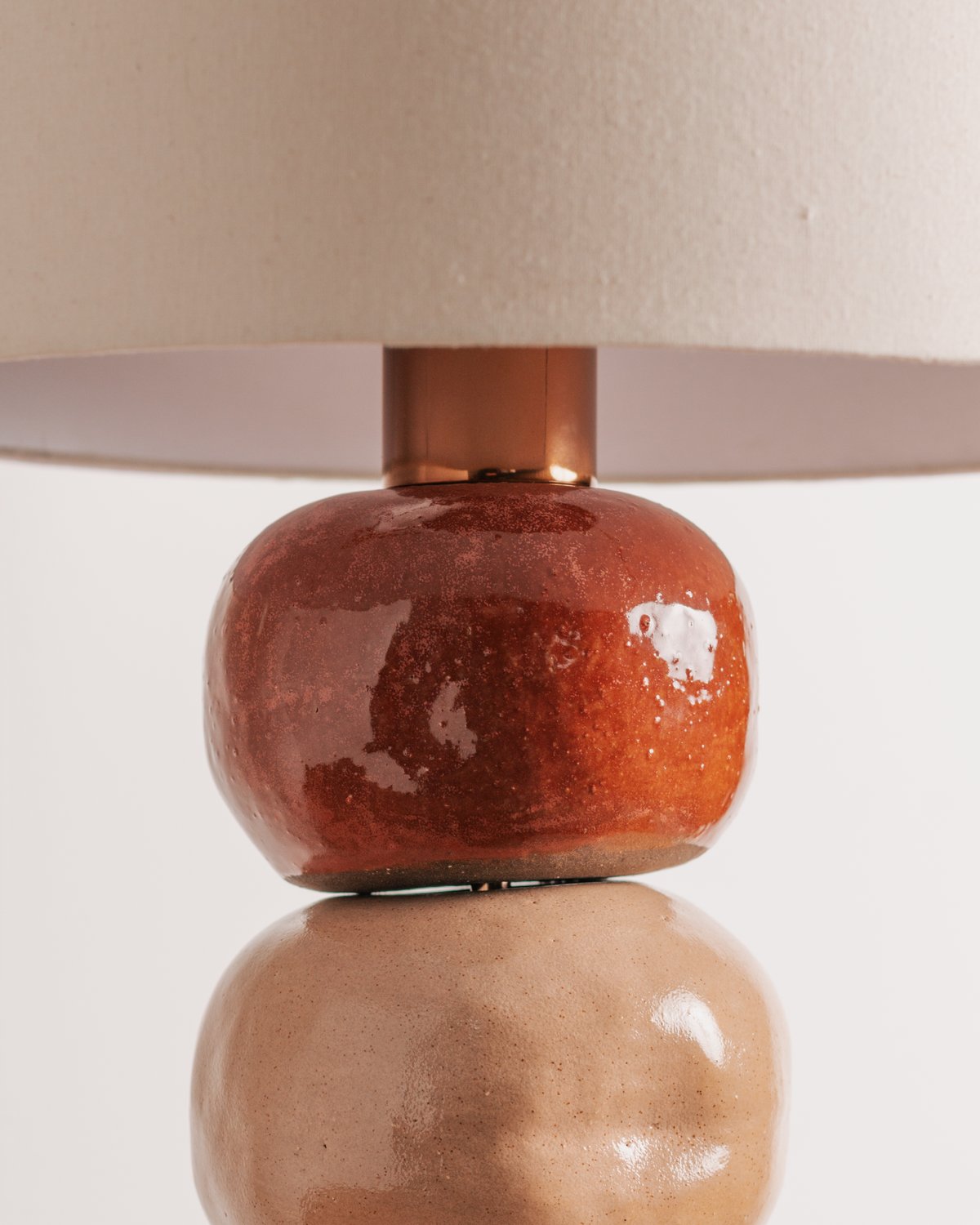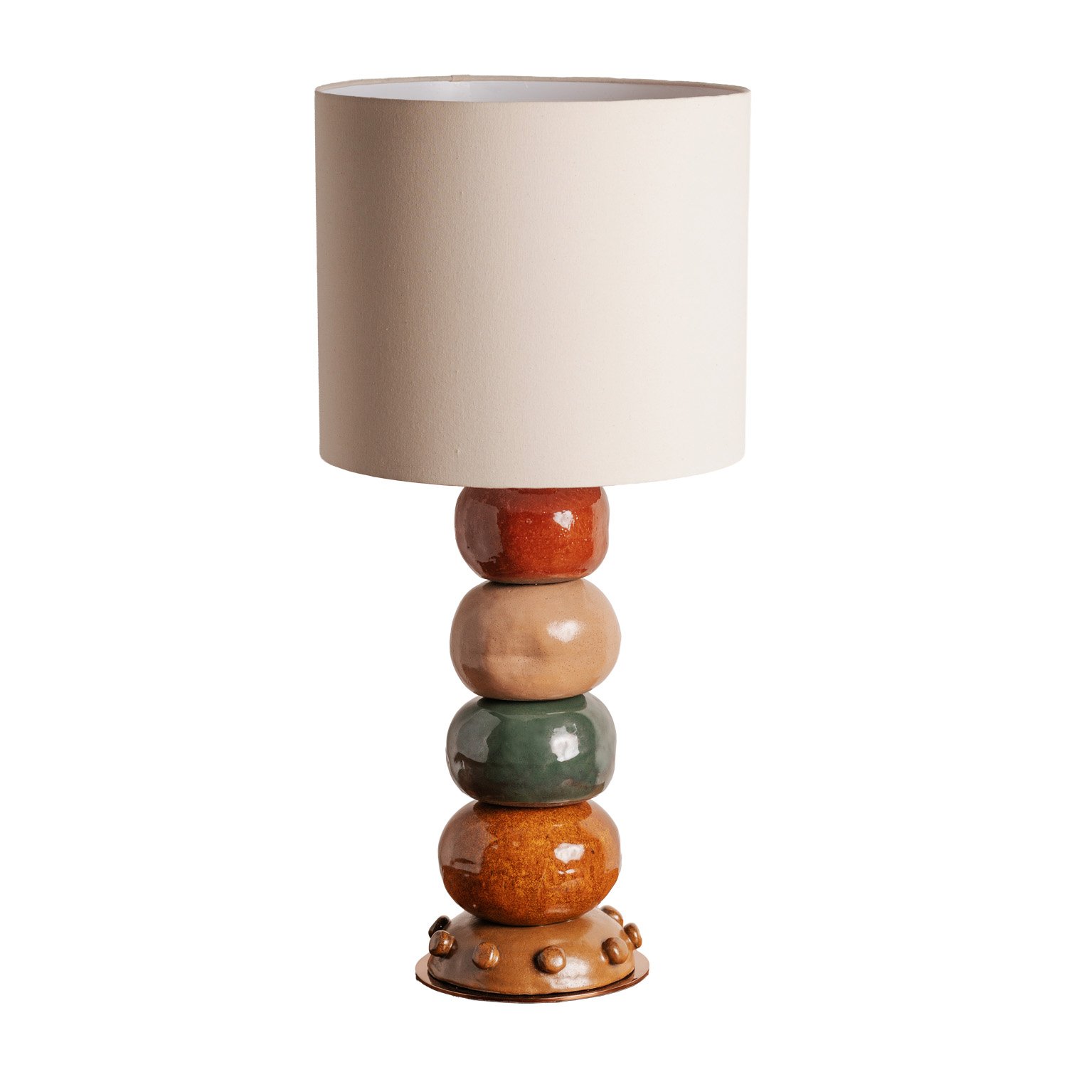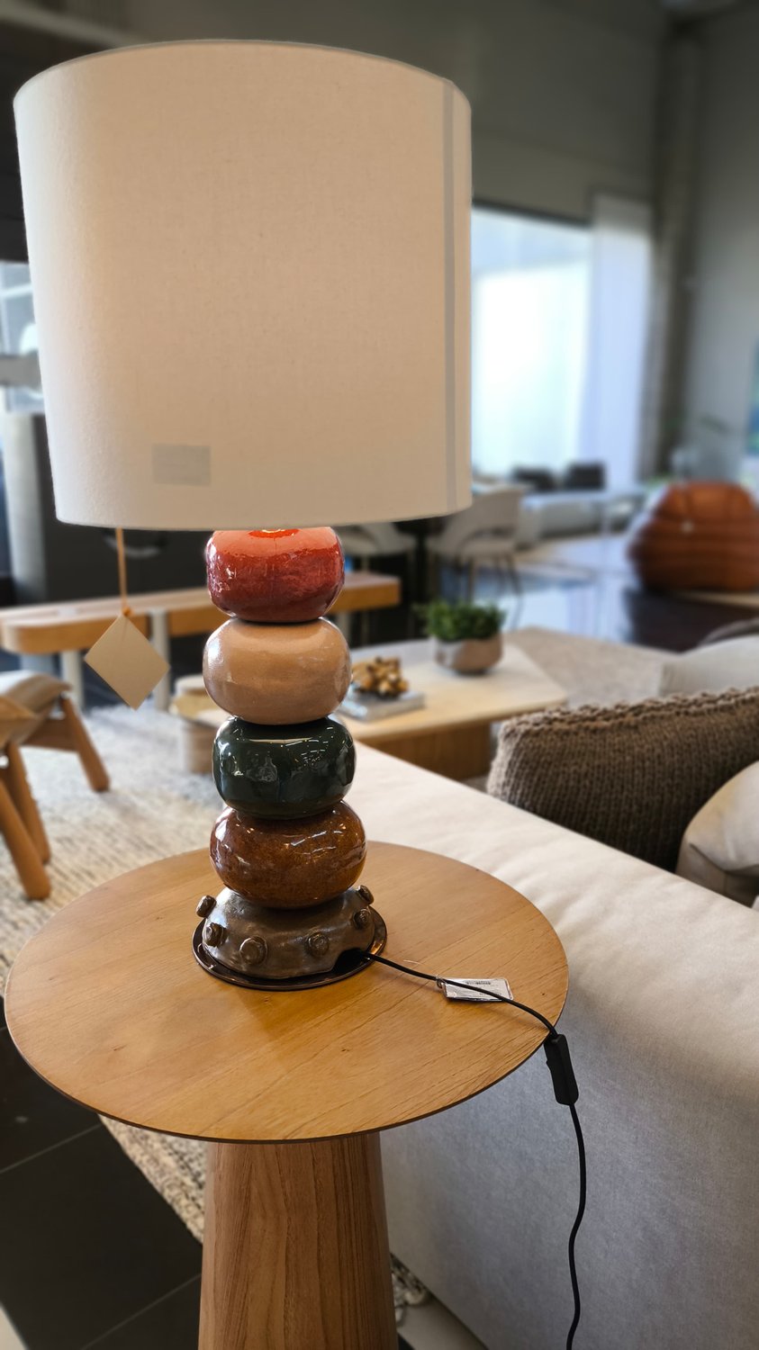 Luminária artesanal em cerâmica colorida, produzida pelo Studio A+K, possui base em aço inox com pintura dourada e cúpula em sarja crua.