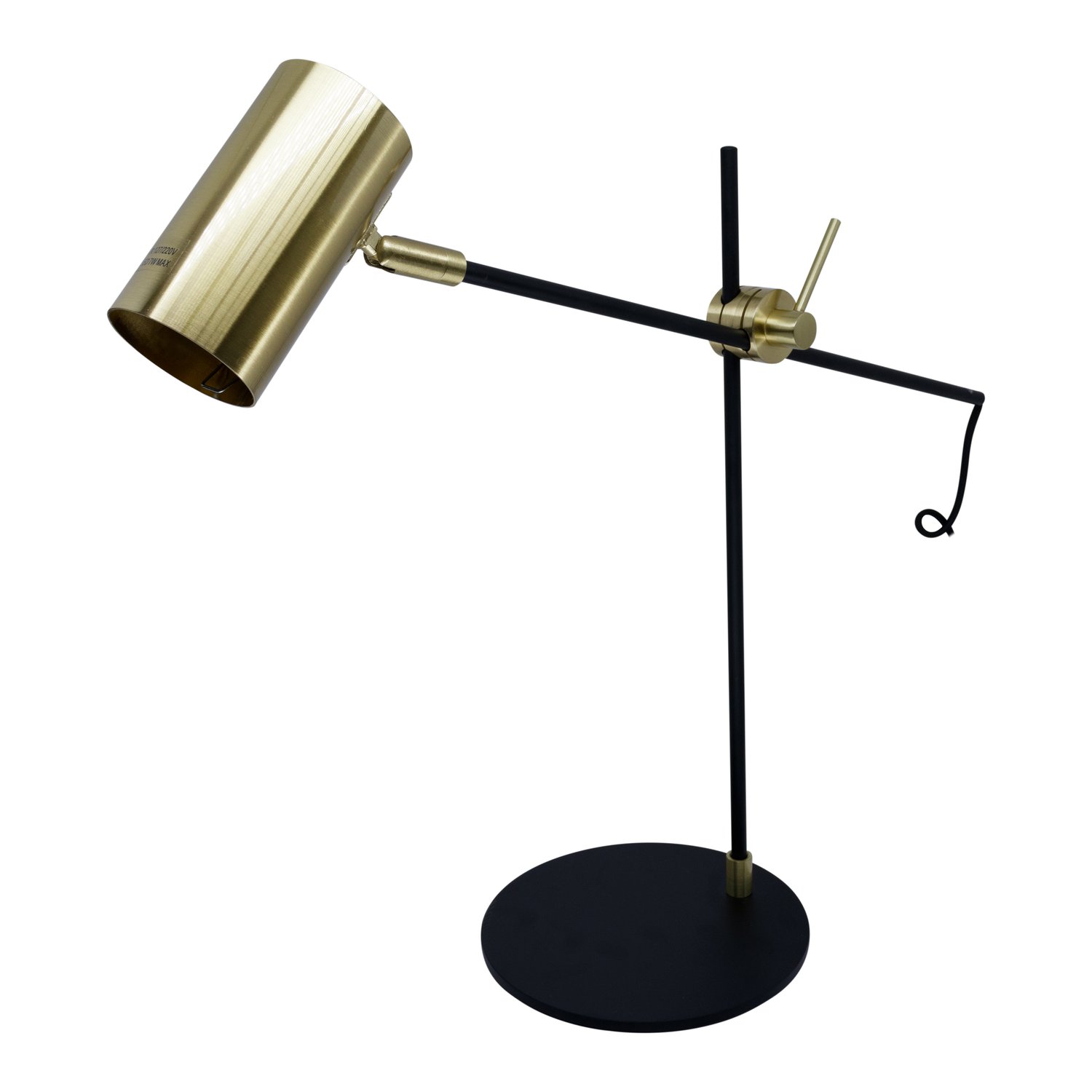 Luminária de mesa com haste e base em preto fosco e cúpula e detalhes em dourado escovado. Possui cúpula, altura e haste ajustáveis. Pode ser utilizada em tomadas 110V ou 220V de acordo com a lâmpada colocada.