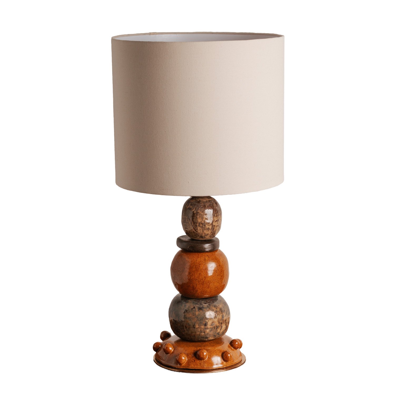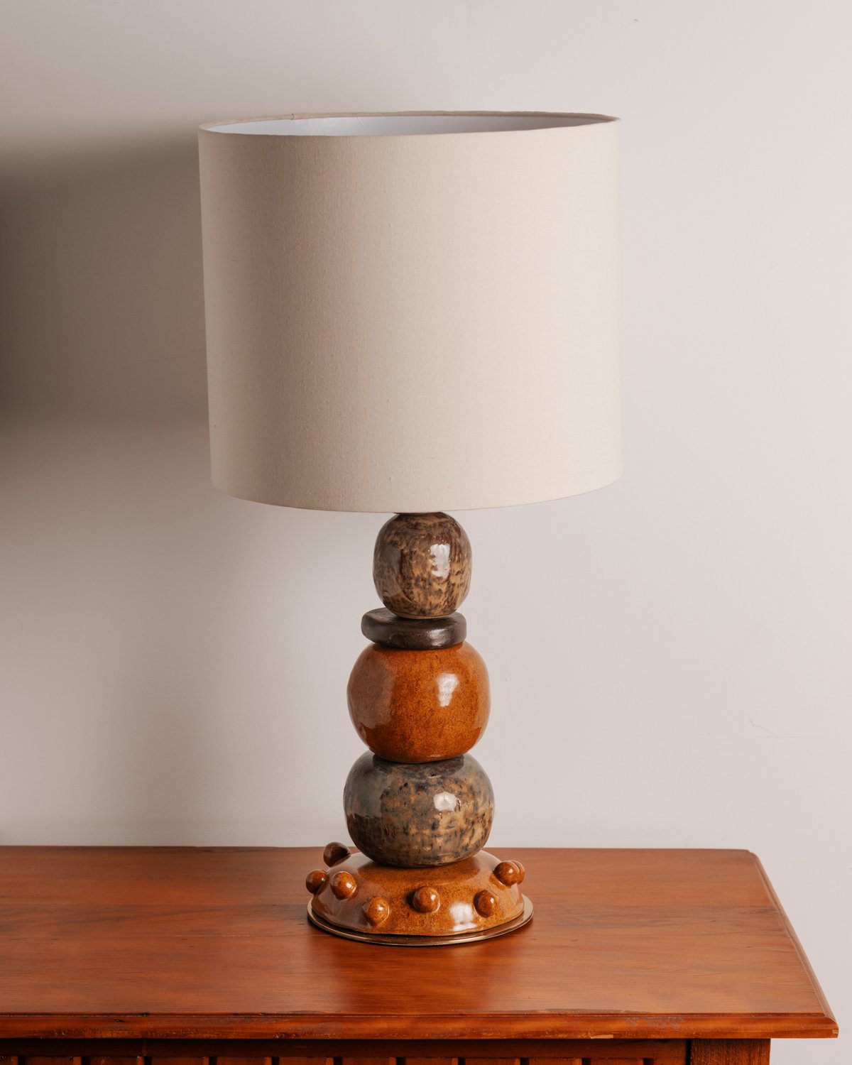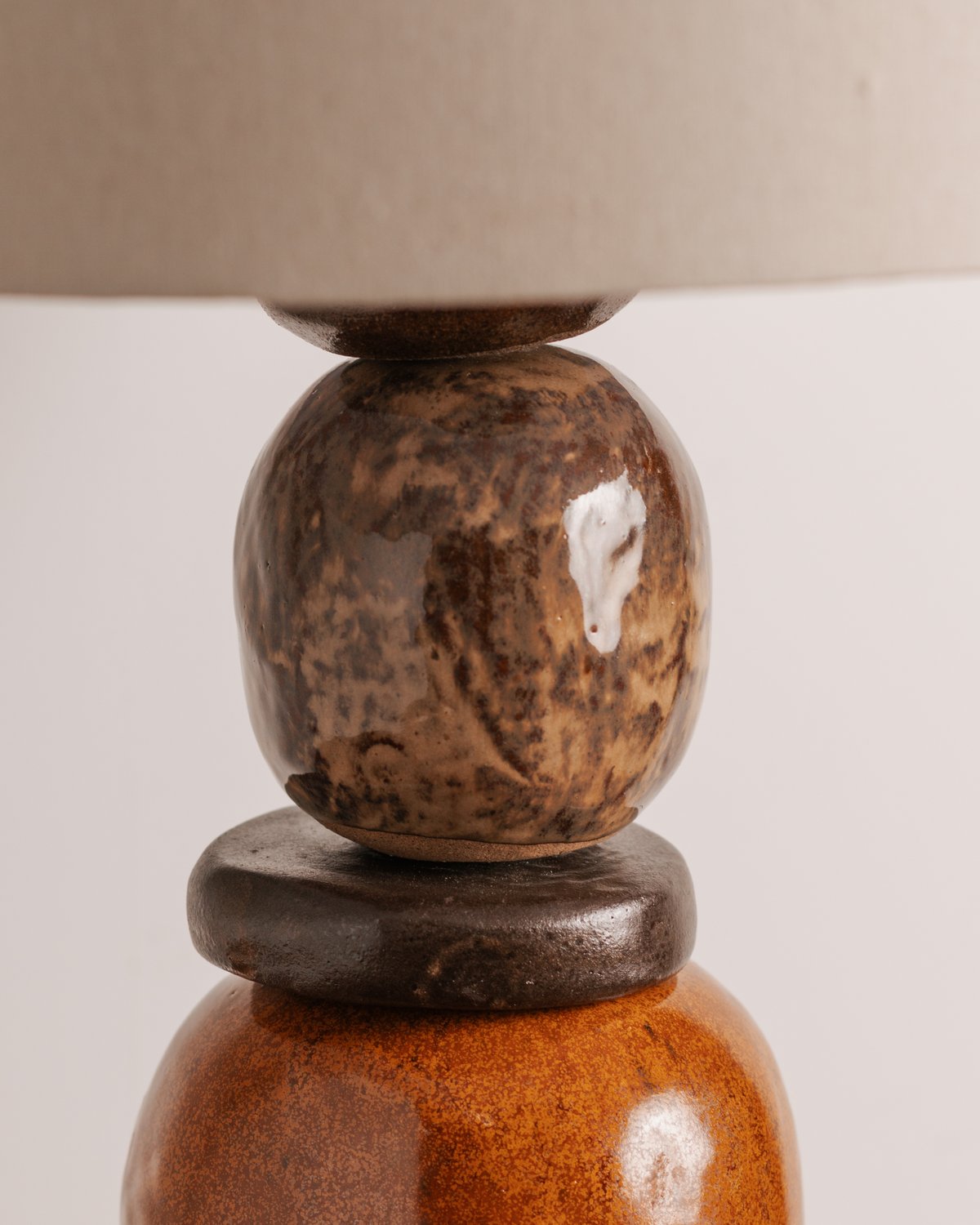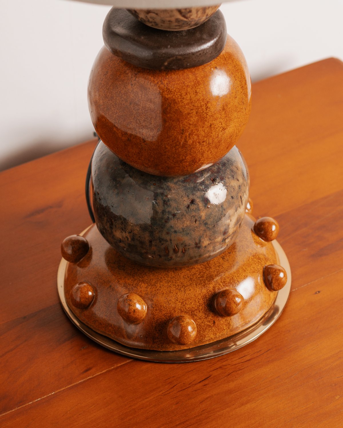 Luminária artesanal em cerâmica colorida, produzida pelo Studio A+K, possui base em aço inox com pintura dourada e cúpula redonda em sarja crua.