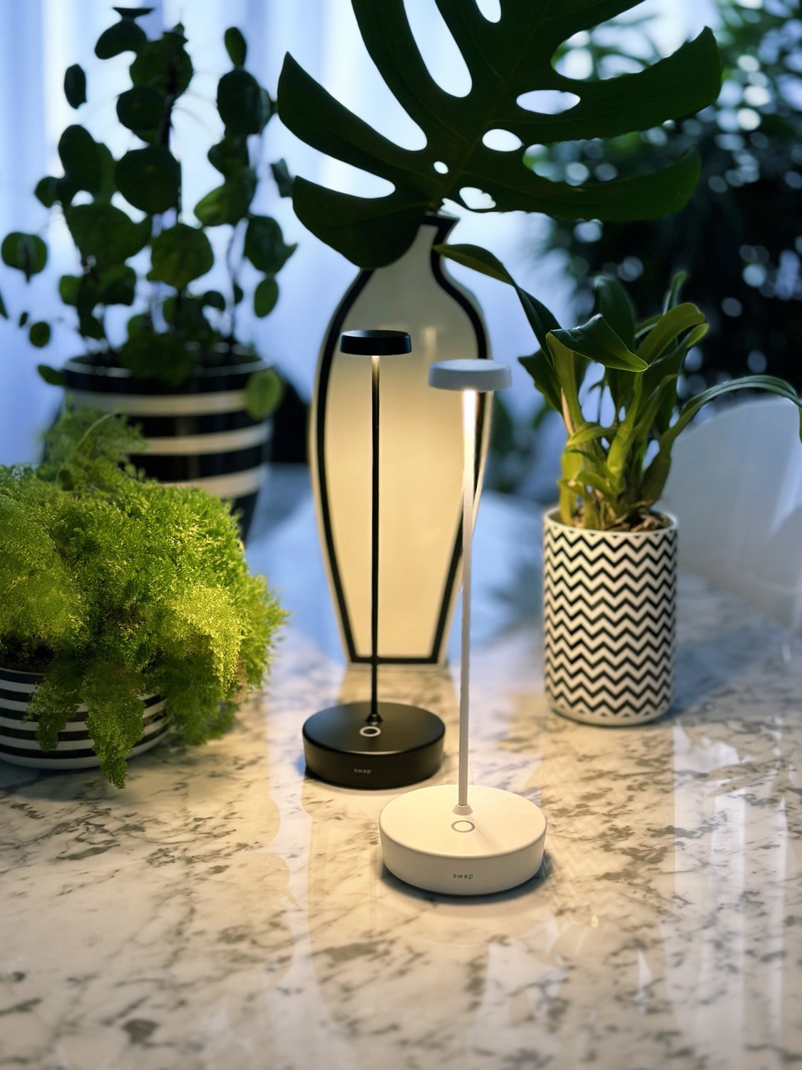 Na versão Table, combina o sistema exclusivo de capas intercambiáveis (swap system) com toda a praticidade da iluminação portátil e recarregável.