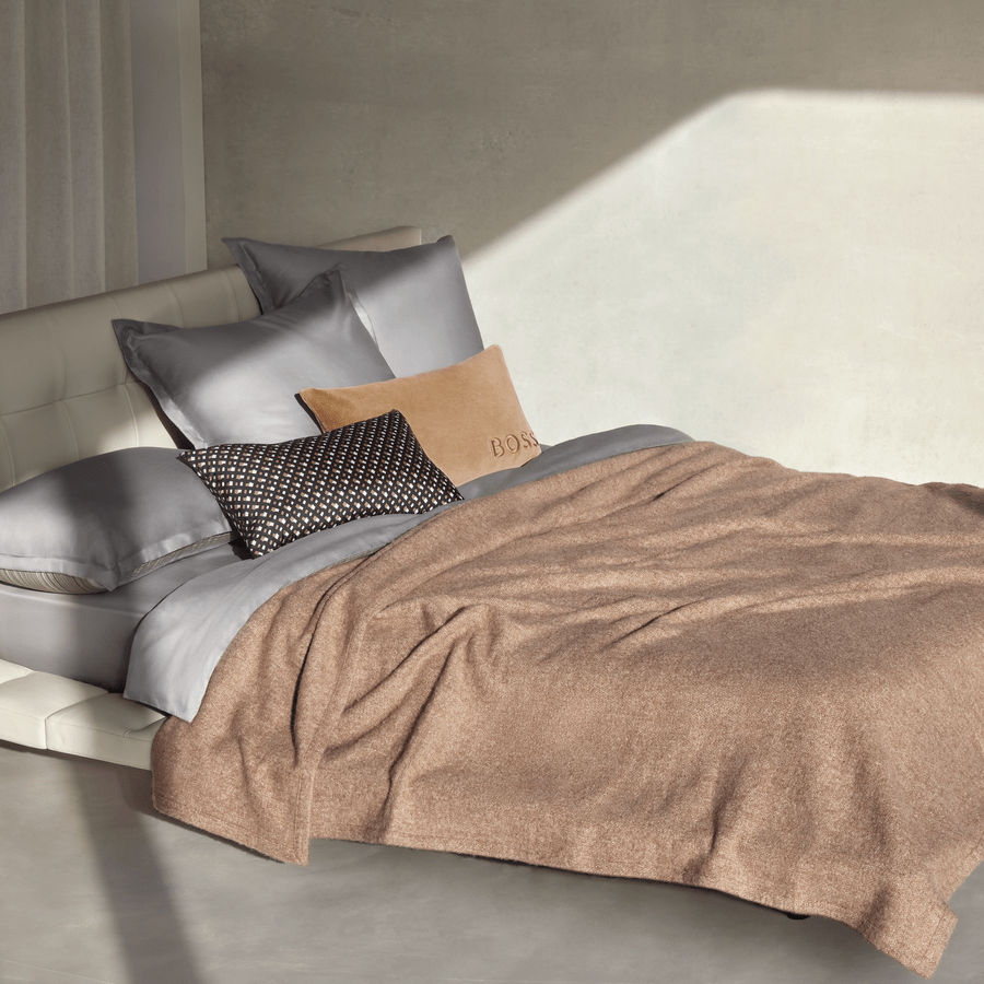 A linha Boss Home reflete as coleções de roupas da marca, oferecendo qualidade superior e estilo impecável. As roupas de cama, roupões e toalhas, assim como todos os acessórios Hugo Boss utilizam matérias-primas macias e naturais. Os detalhes dos designs nas roupas de cama são inspirados por sua alfaiataria de acordo com o icônico terno Hugo Boss, moderno, elegante e estruturado.