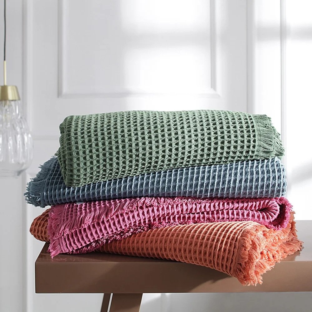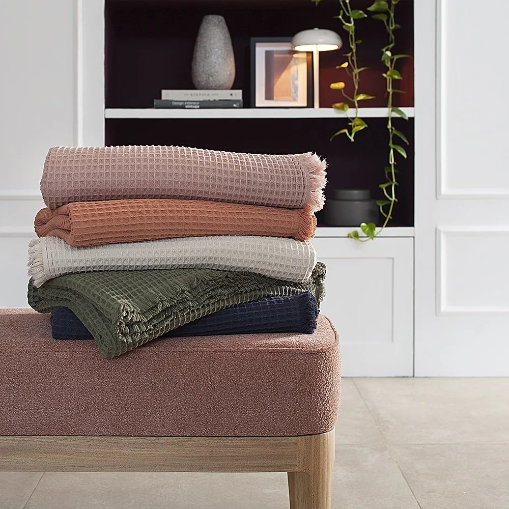 Manta Piquet III - Buddemeyer Luxus. Essencialmente macia e confortável, a Manta Piquet III tem a suavidade convidativa do puro algodão. Sua estrutura em forma de colméias proporciona experiências sensoriais delicadas e reconfortantes. O acabamento com franjas é charmoso e dá um toque boêmio. Versatilidade em combinações para diversos ambientes. A Buddemeyer é referência em qualidade e estilo.