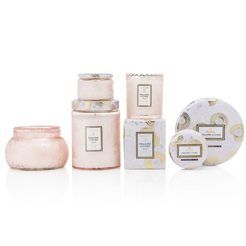 Mini Vela Pote Relevo Panjore Lychee Voluspa. Com duração de 25 horas, é perfeita para presentear alguém especial. Ela possui um design moderno, com pote em desenho de alto relevo, sendo ideal para fazer parte da decoração. Aroma com notas de lichia, cassis e suculentas peras asiáticas.