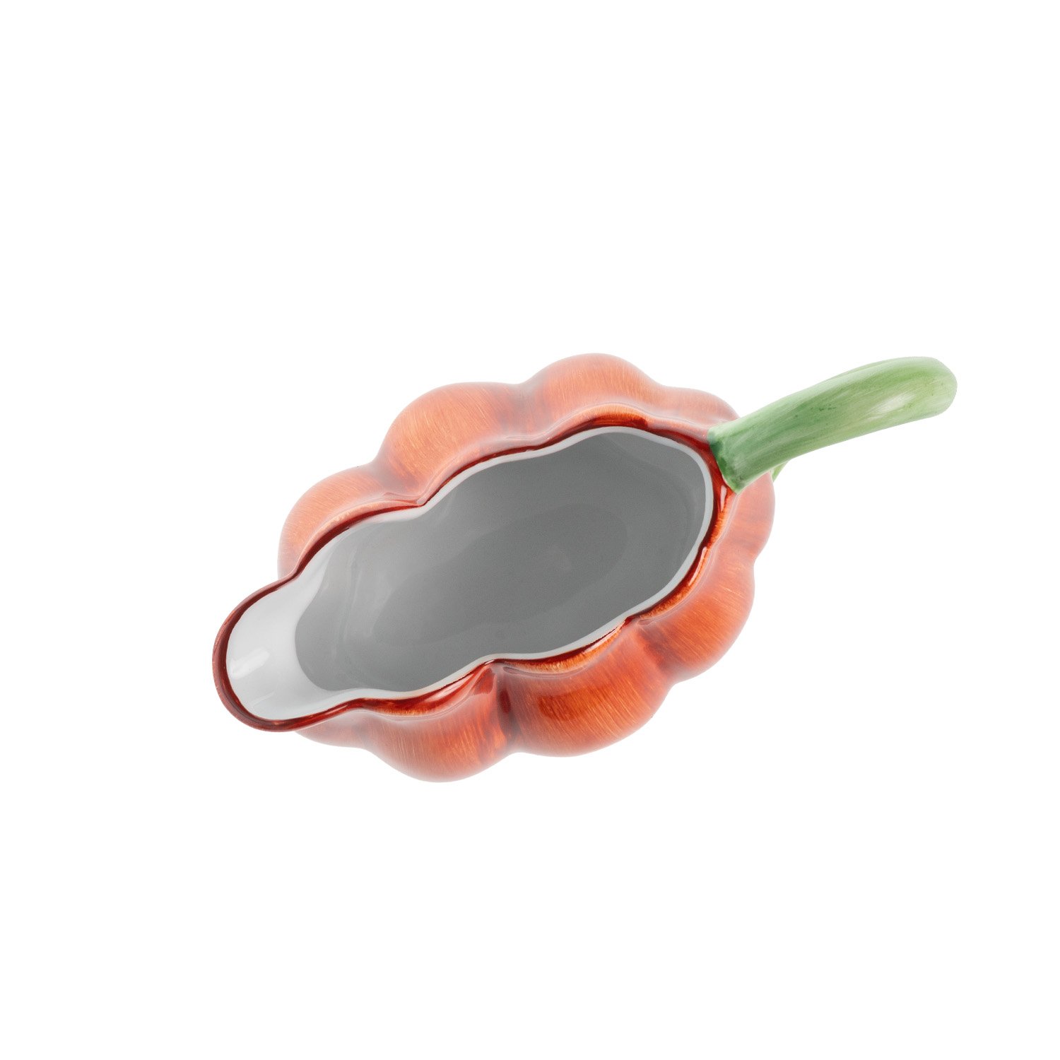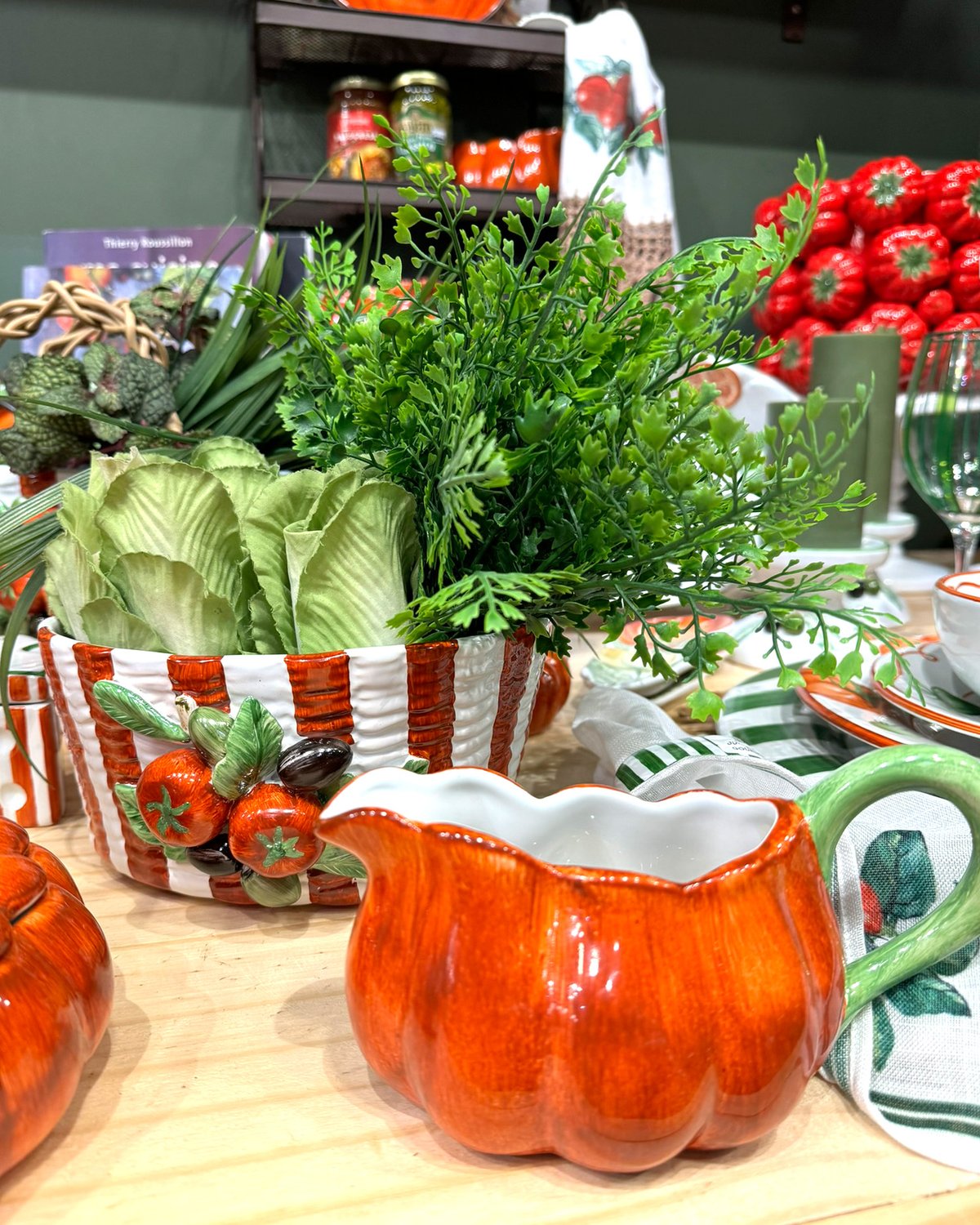 Molheira de cerâmica artesanal com desenho de tomate em alto relevo e pintura manual nas cores verde e vermelho.