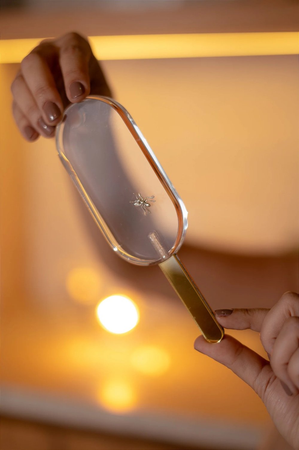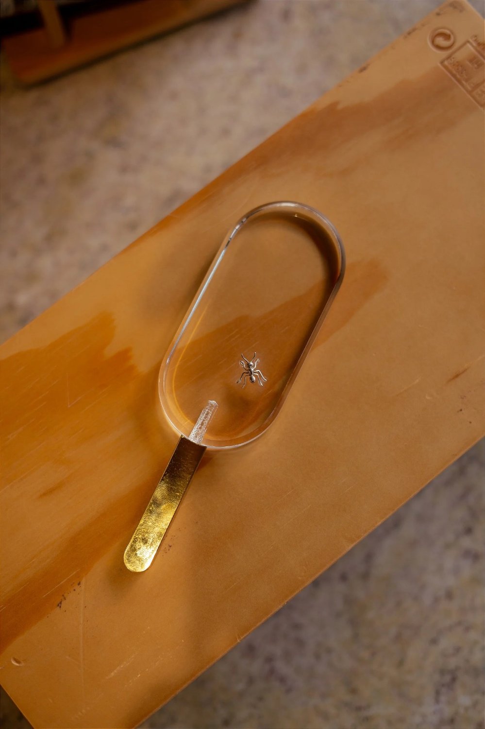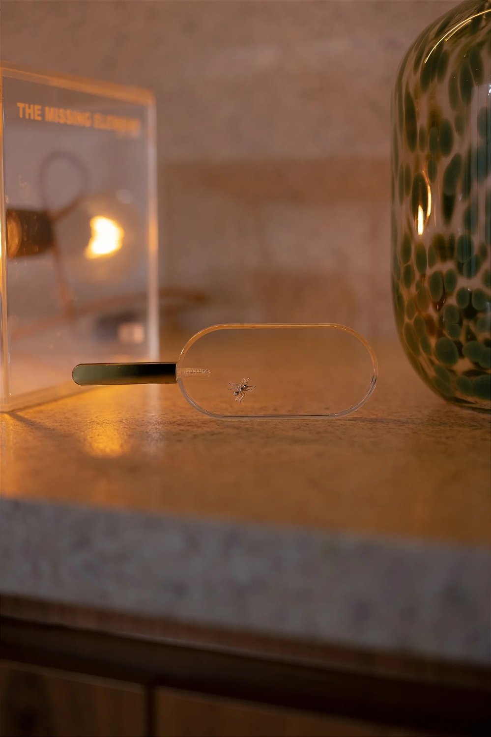 Nessa peça a nostalgia e sofisticação se unem em um design contemporâneo. O picolé, feito em acrilico cristal, traz o frescor e leveza da peça, enquanto o cabo metalizado reflete elegância e luz. Sobre o picolé se atreve uma pequena formiga de metal banhada a ouro, inevitavelmente atraída pelo "premio".