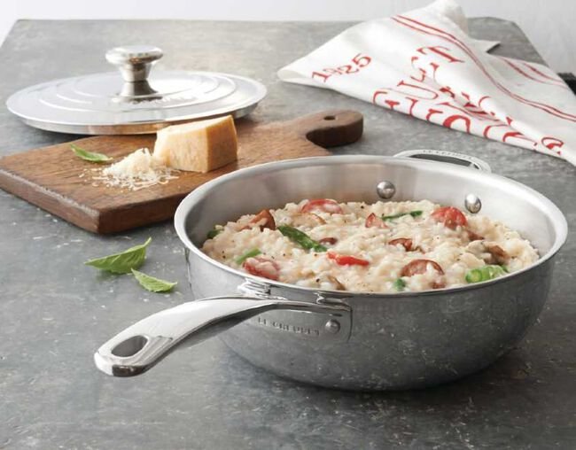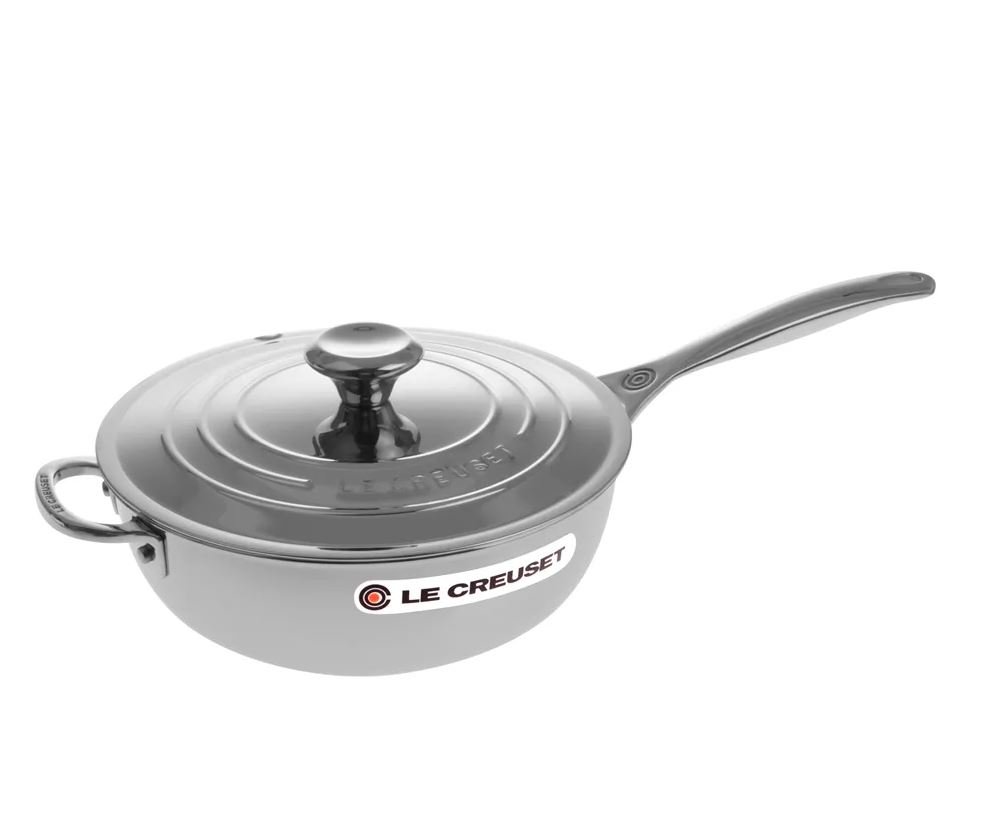 Panela Rasa da Le Creuset. Feita de aço inox, projetada com 3-Ply, ela conduz e distribui o calor uniformemente, sendo ideal para várias receitas. Possui um núcleo de alumínio que aquece de maneira rápida e uniforme e é protegido pelo aro laminado, vedado e polido. Sua camada externa é magnética e infundida com titânio para resistir à descoloração. Já a camada interna é feita de aço inoxidável de grau cirúrgico para uma superfície de cozimento segura e estável. A peça que faltava em sua cozinha!