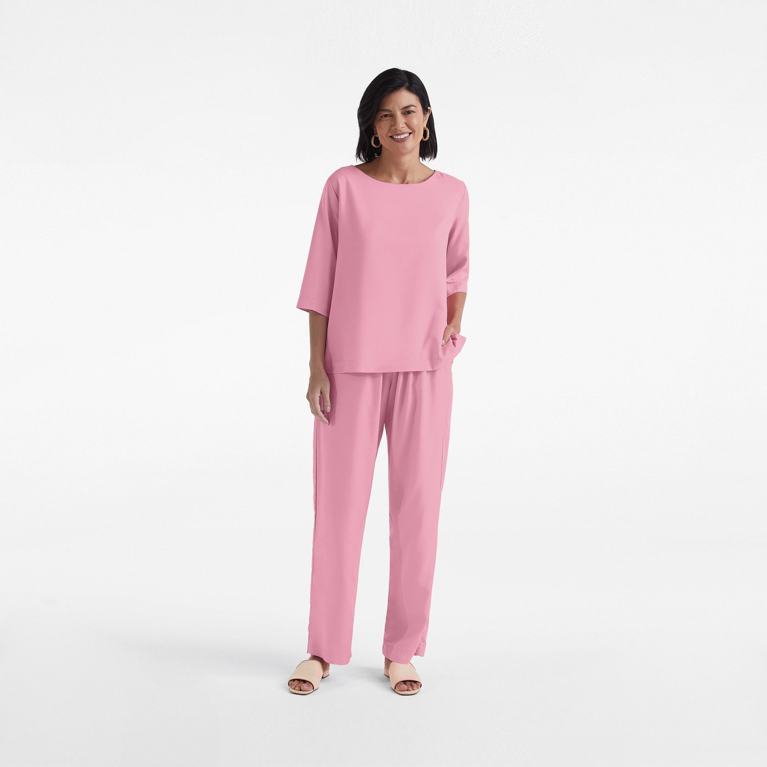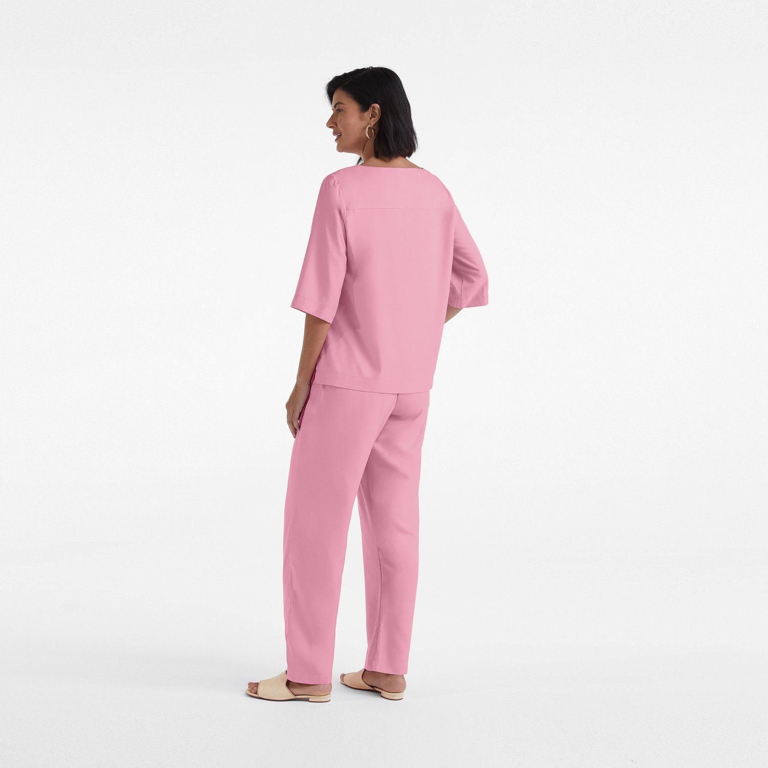 Acabamento: Calça com aplicação de bolsos e a camisa com mangas 3/4; Pijama longo; Viscose com brilho e caimento diferenciado