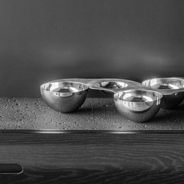 Luna é impecável à mesa. A matéria-prima base é o aço inox 18/10. Esse número é o selo de qualidade dos objetos, faz referência à composição do metal: 18% de cromo e de aproximadamente 10% de níquel. O oxigênio ao se combinar com o cromo forma uma fina camada de óxido de cromo em sua superfície, que concede ao aço inox uma elevada resistência à corrosão. Por isso, quanto melhor for o polimento de uma peça, mais em contato sua superfície estará com o ar e consequentemente, mais resistente à oxidação.