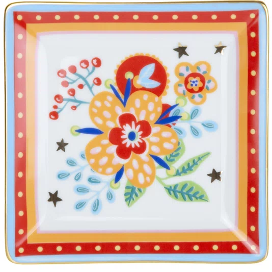 Porta objeto quadrado em porcelana, decorado com delicada estampa floral colorida que transmite alegria e vivacidade. O contorno em vermelho com detalhes dourados realça a sofisticação da peça. Ideal para organizar pequenos itens e, ao mesmo tempo, agregar charme e elegância à decoração.