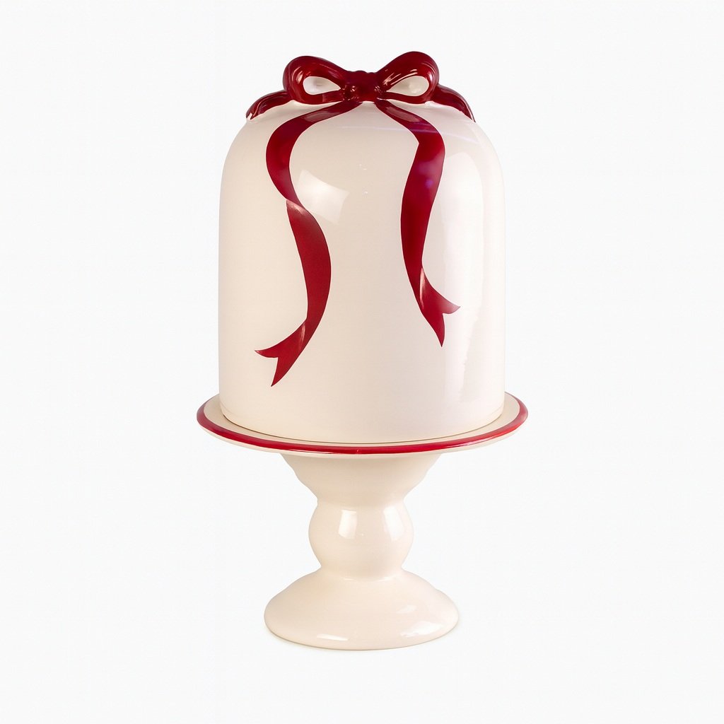 Coleção: Charlote Material: Cerâmica / Pintura Manual Acabamento: Alto Relevo Cores: Branco e Vermelho Composição: 01 Porta Panetone Circunferência: 18 cm Altura: 34,5 cm