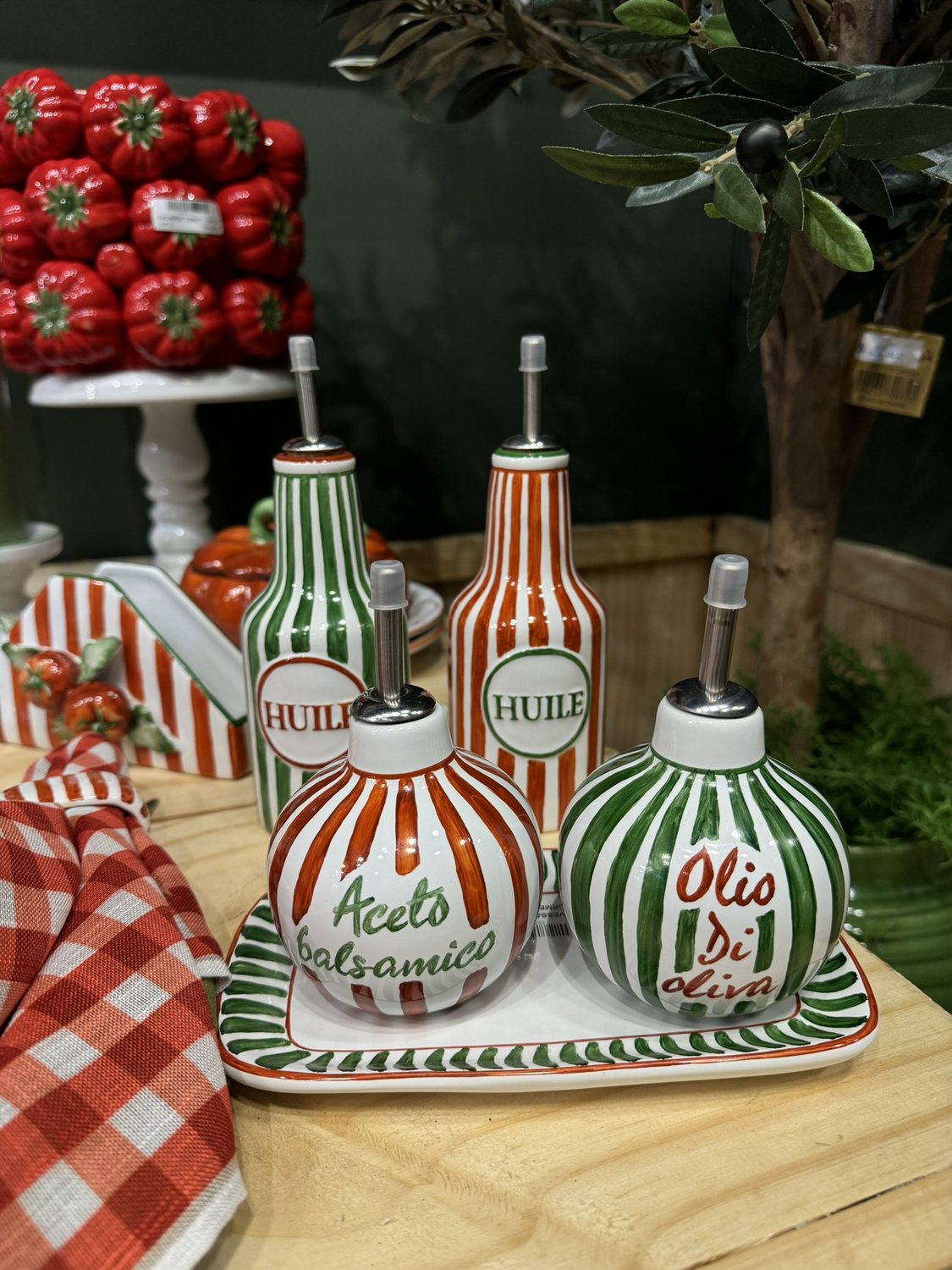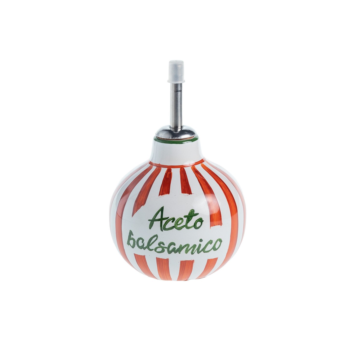 Porta vinagre balsâmico pequeno, em formato redondo, com dosador. Produzido em cerâmica artesanal com pintura manual listrada na cor vermelha e escrita na cor verde.