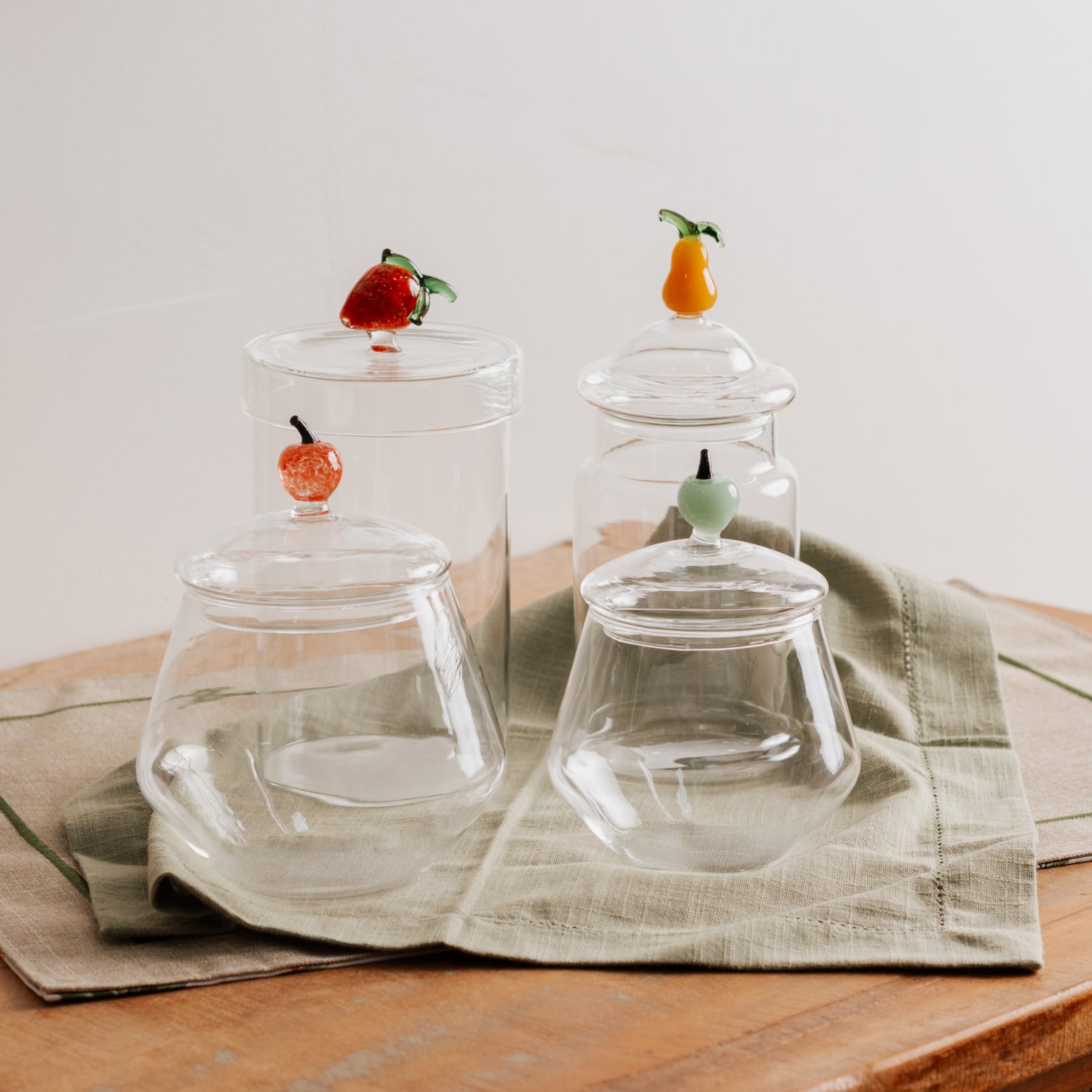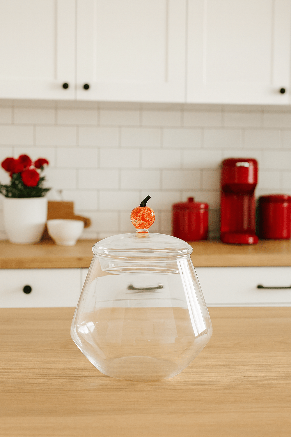 Pote em vidro borossilicato transparente, possui tampa com pegador em vidro em formato de maçã vermelha. Com capacidade para 800 ml, e é ideal para armazenar biscoitos ou outros alimentos, ou usar de forma decorativa na cozinha.