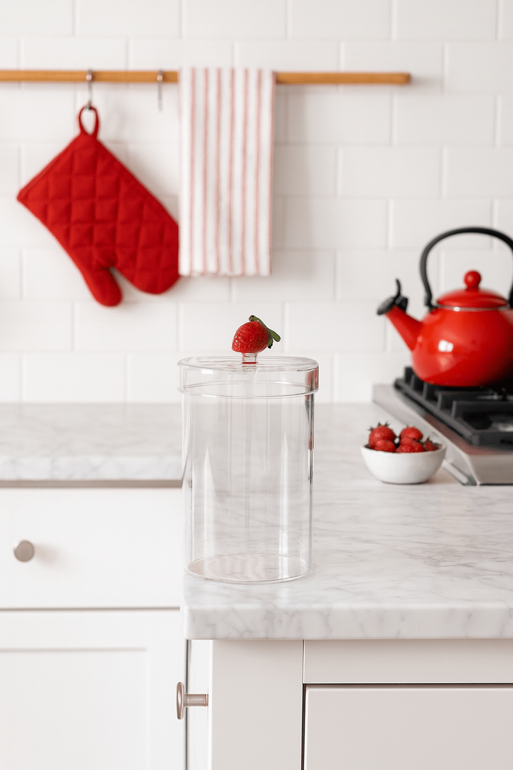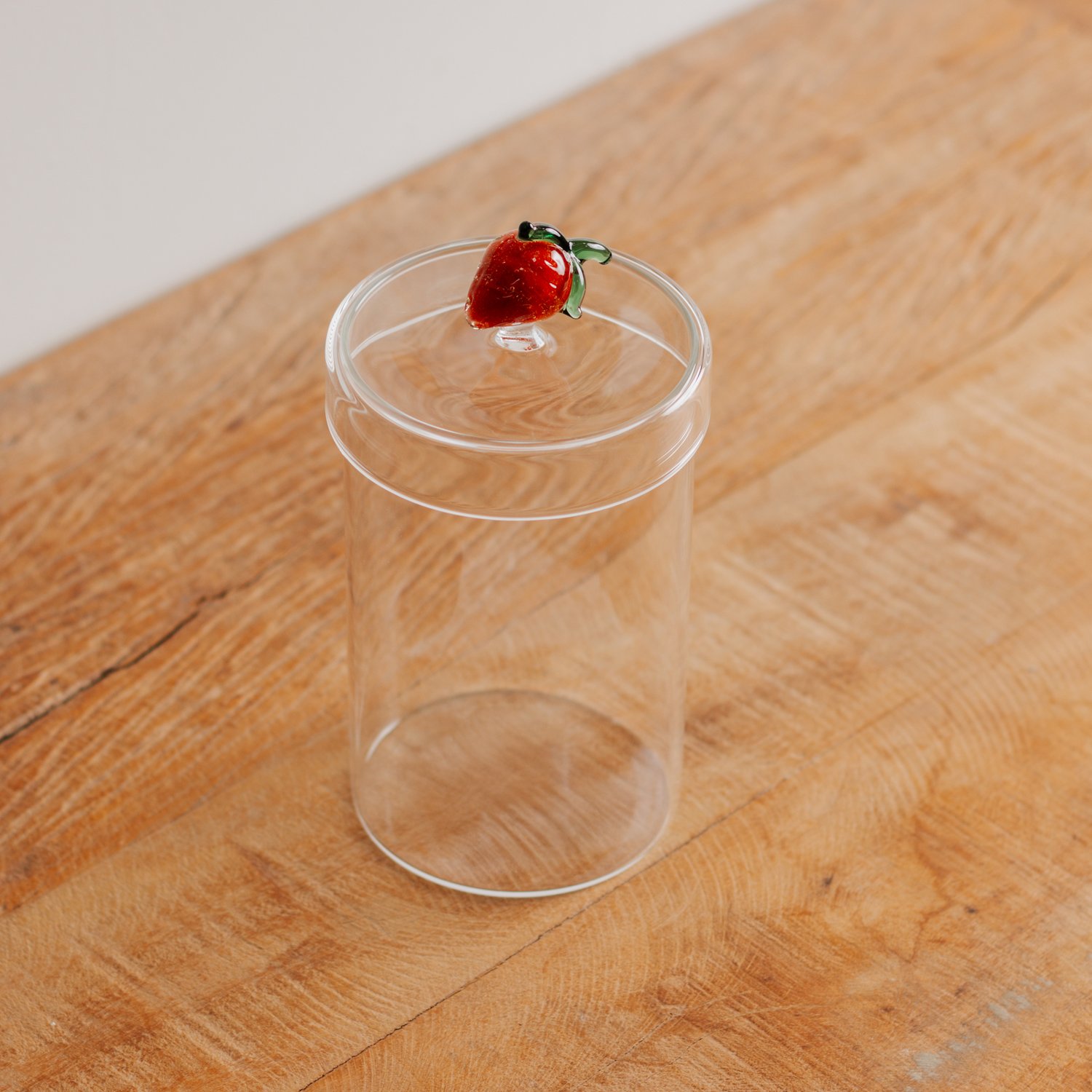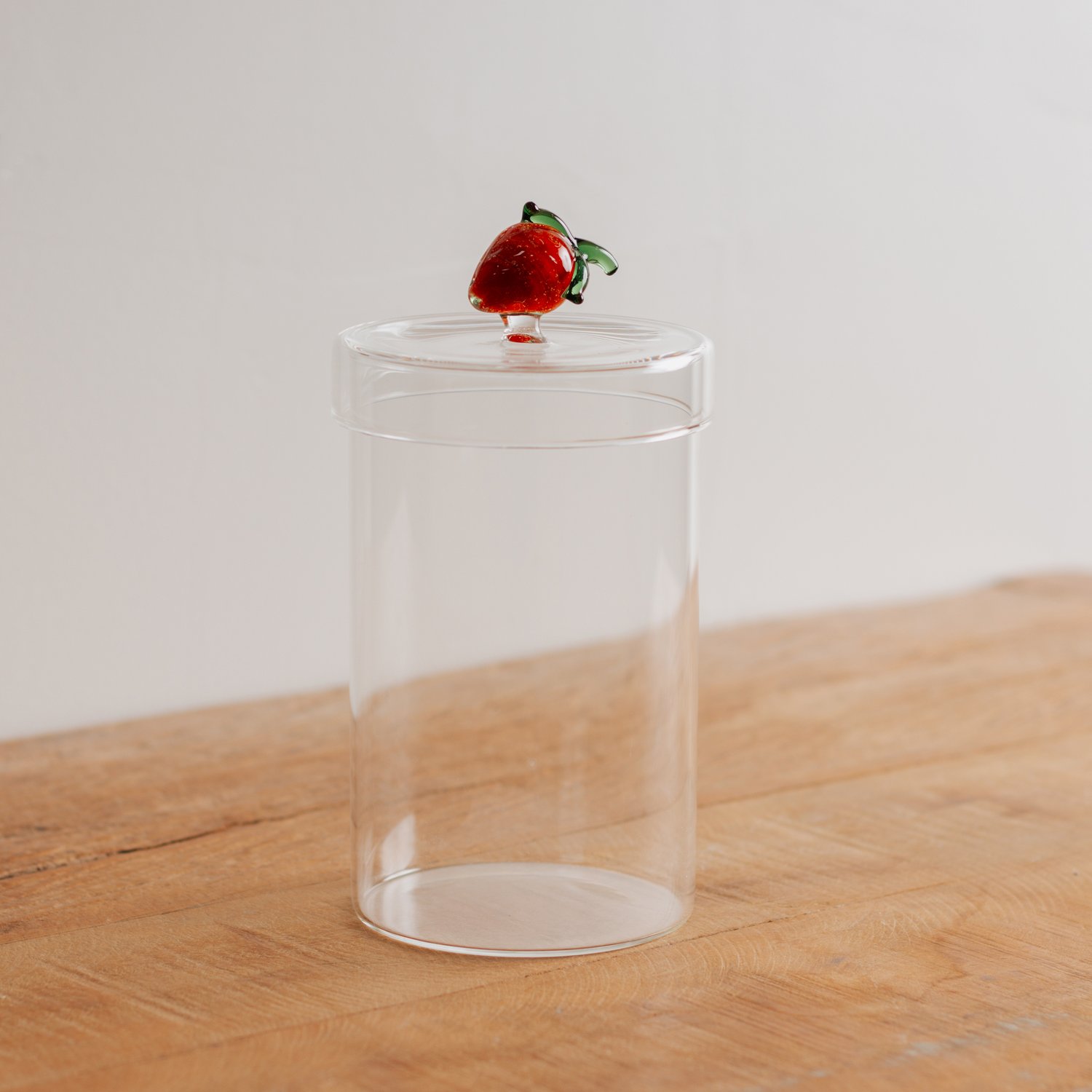 Pote em vidro borossilicato transparente, possui tampa com pegador em vidro em formato de morango. Com capacidade para 750 ml, e é ideal para armazenar biscoitos ou outros alimentos, ou usar de forma decorativa na cozinha.