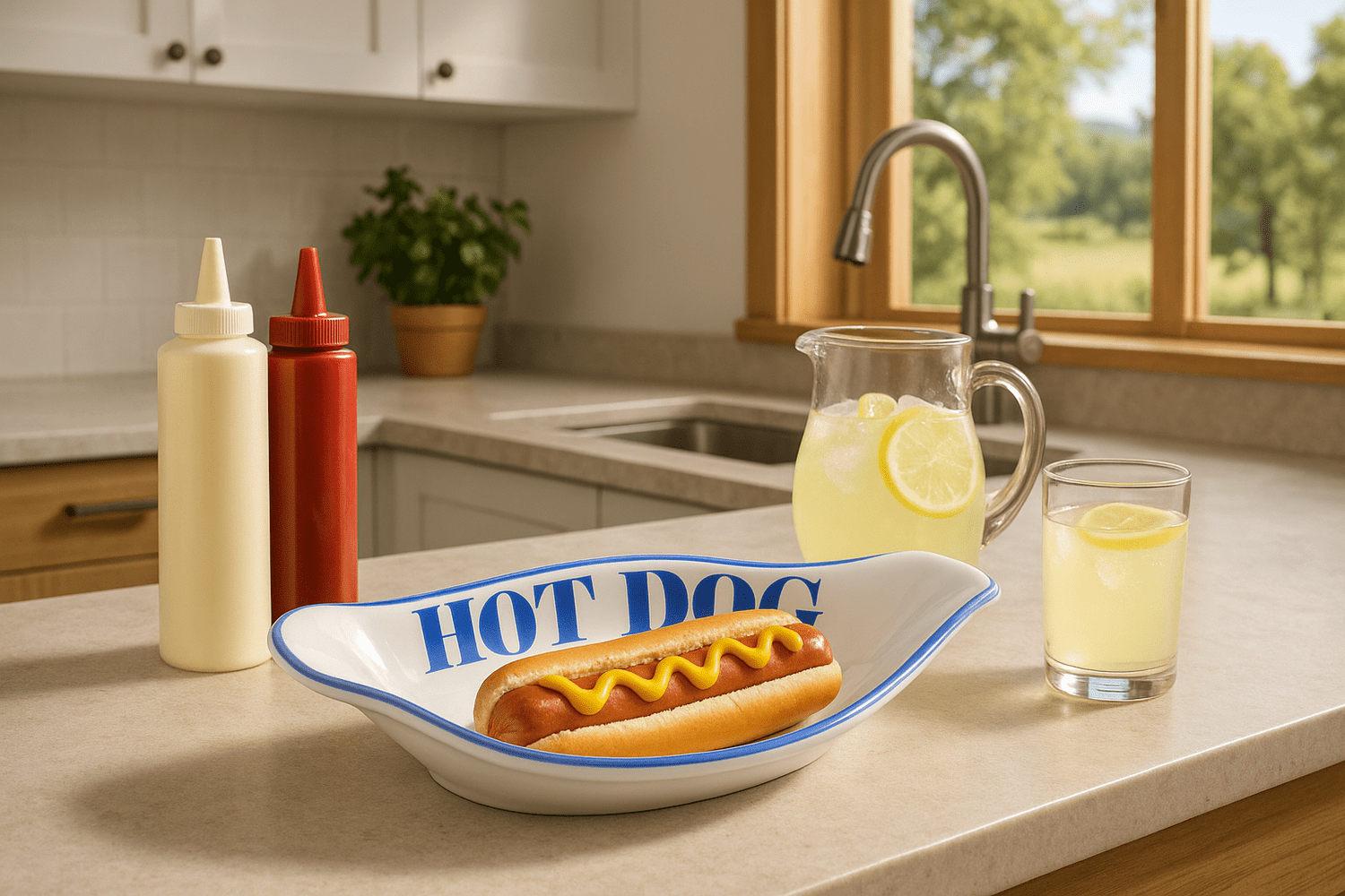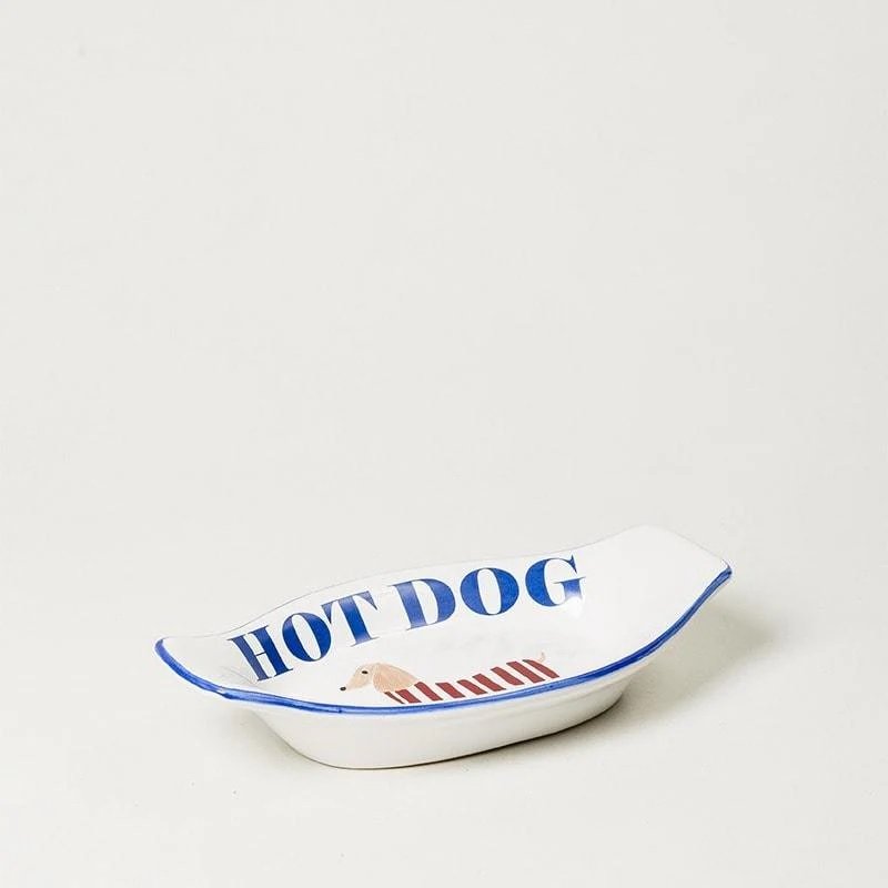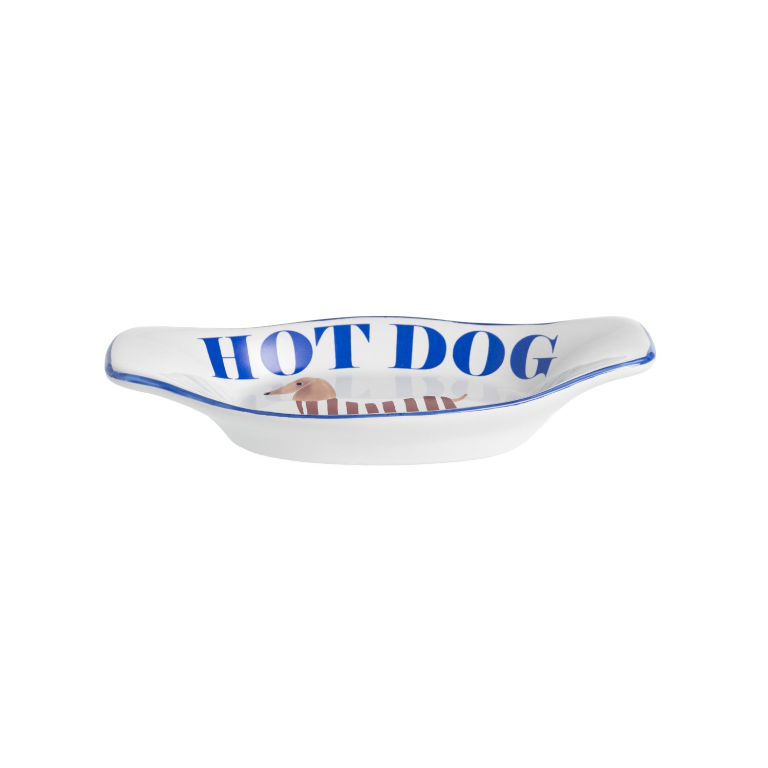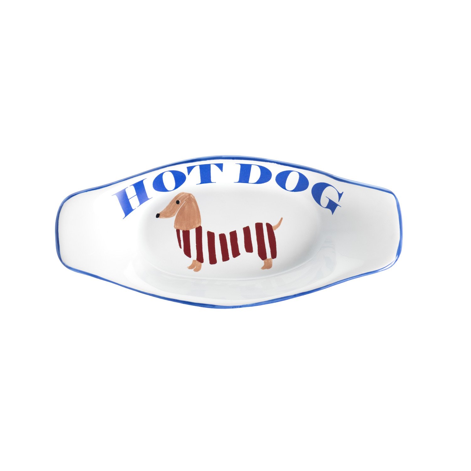 Prato oval de cerâmica artesanal em formato com desenhos e escrita da coleção Hot Dog, ideal para servir cachorro quente.