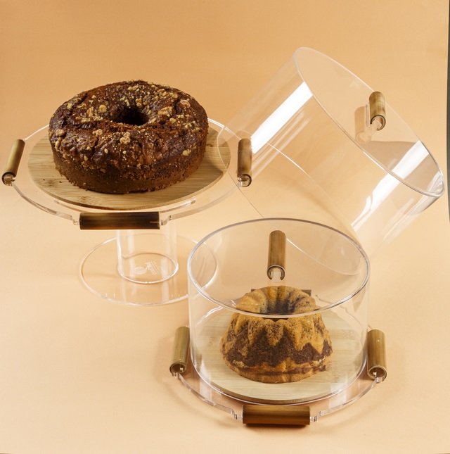 Prato para bolo em formato redondo com tampa e acabamento em acrílico e bambu.