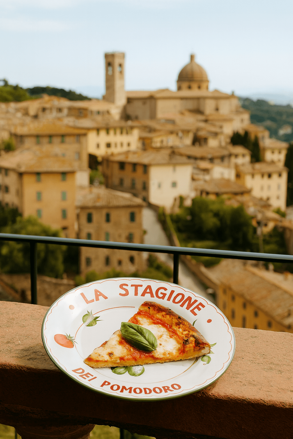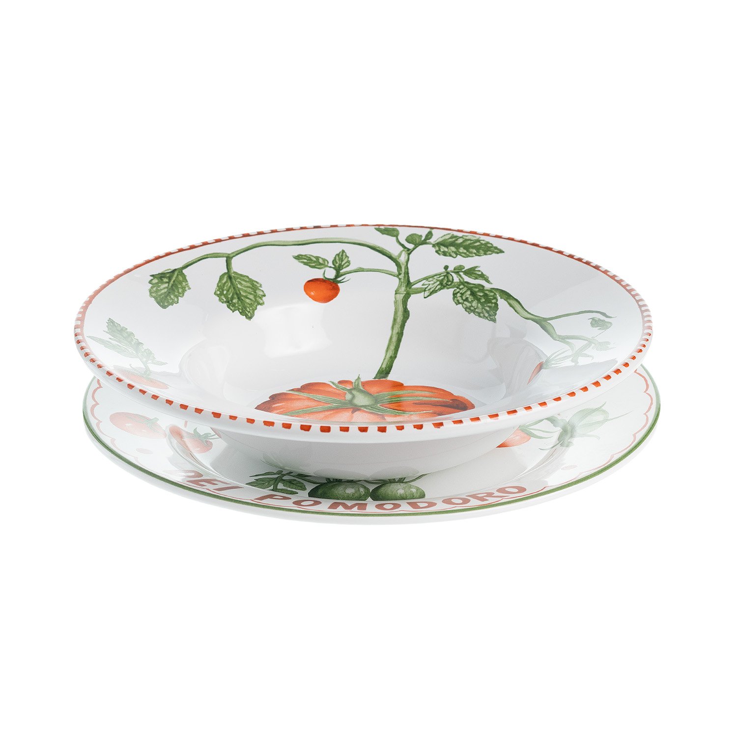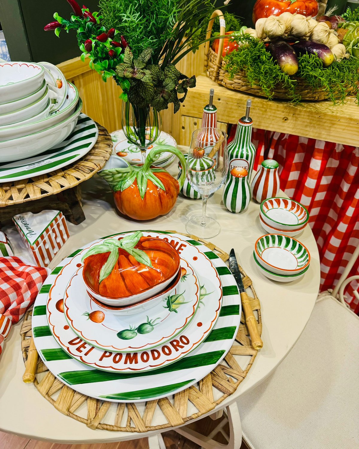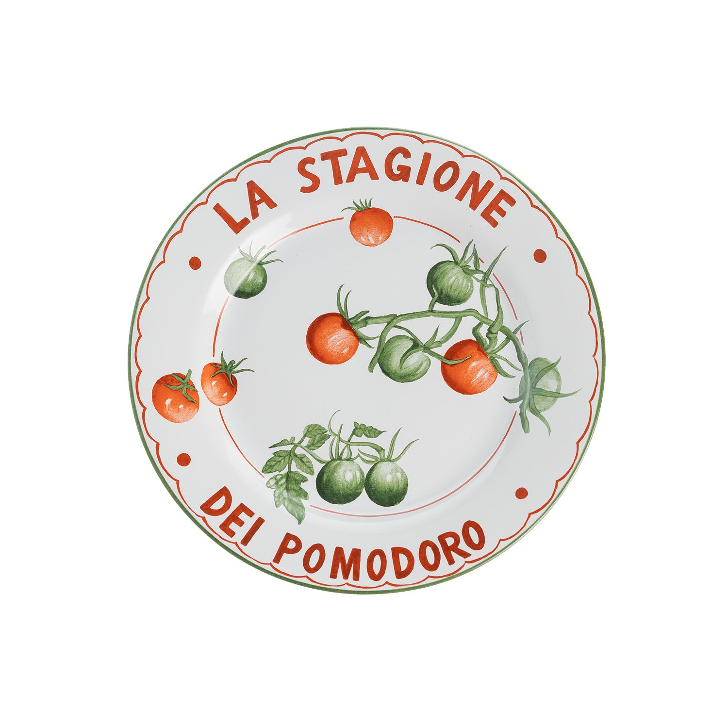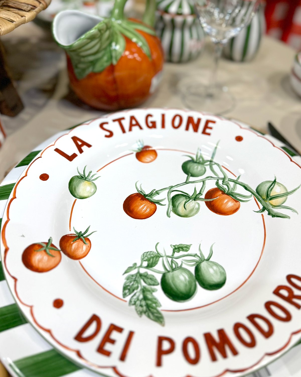 Prato raso redondo, produzido em cerâmica artesanal com pintura manual de ramos de tomates cereja e escrita La Stagione del Pomodoro, nas cores verde e vermelho.
