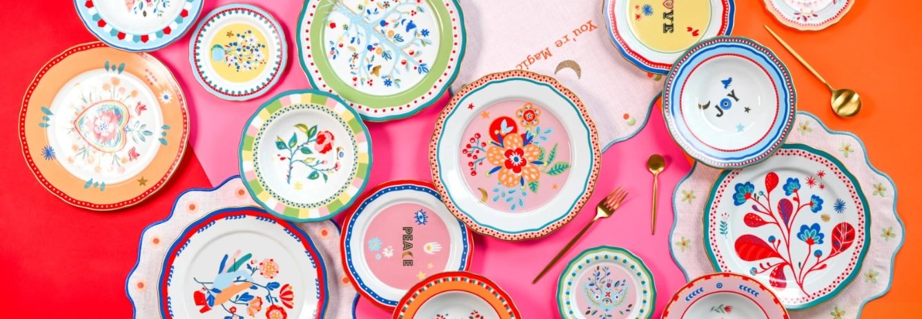 A coleção Mamma Mia foi concebida com o objetivo de infundir vitalidade não apenas na mesa, mas também em todos os cantos da casa através de um caleidoscópio de cores, símbolos intrigantes, escritas misteriosas e desenhos envolventes.
